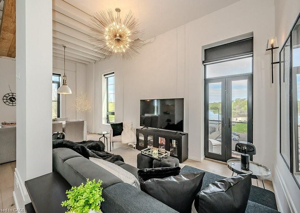 Welcome to Riverbank Lofts, a boutique historic stone conversion on the Speed River in the heart of Hespeler Village. This rare corner unit offers luxury with 12' ceilings, exposed beams, and oversized windows showcasing river, pond and waterfall views. Featuring 2 bedrooms with private ensuites, a powder room, and a show-stopping 18' island kitchen with built-in appliances, servery, and pantry. High-end finishes include European white oak flooring, heated floors in baths and laundry, custom built-ins, automatic blinds, and designer lighting. One of only three units with a private river-view balcony and a 2-car garage. Enjoy amenities like a fitness centre, common lounges, bike storage, and direct access to trails and the river. Steps to shops, restaurants, and cafes, with easy access to Hwy 401-this is elevated loft living in one of Cambridge's most desirable locations. Virtual tour and some photos are staged.