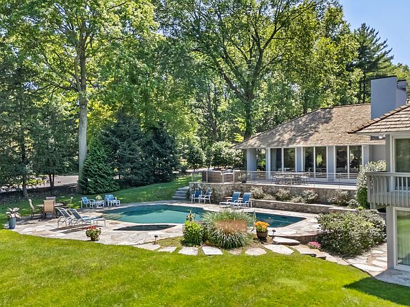 Beautifully updated and move-in ready, this stunning 5-bedroom, 4.5-bath contemporary home offers exceptional privacy and effortless indoor-outdoor living. Set on a professionally landscaped lot, the home was designed with soaring cathedral ceilings, expansive windows, and sun-filled open-concept living and dining areas. The recently renovated kitchen is a chef's dream featuring high-end appliances, custom cabinetry, and a large center island perfect for cooking, entertaining, or casual dining. The spacious primary suite is your personal escape, complete with a private balcony and spa-like bathroom featuring skylights, jetted tub and a glass-enclosed shower. Two additional en-suite bedrooms and a dedicated laundry room complete the main level. The garden-level offers flexible living with two more bedrooms, a full bath, and a bonus room ideal for a gym, play space or media room. Step outside to your own private oasis an expansive stone patio, in-ground pool and spa, and a large grassy yard create the perfect backdrop for relaxing, entertaining, or family fun. Additional highlights include a home office space, heated tile flooring, full house generator, and Lutron lighting system. Don't miss this rare opportunity to rent a private retreat just minutes from downtown Greenwich, schools, and commuter routes. Tenant is responsible for all utilities. Grounds care and pool maintenance will be covered by landlord. This would be a year (or longer) lease with a flexible start date. Pets will be considered.