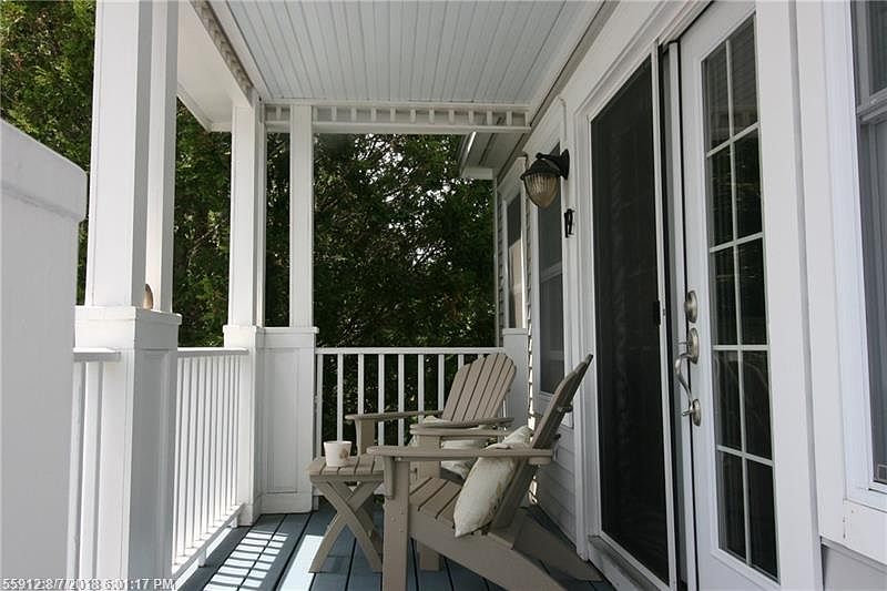 Easy living in this nicely situated townhouse with distant ocean views of Penobscot Bay. Enjoy beautiful sunrises from your perch on the front porch or the open kitchen, dining room, and living area which also features a gas fireplace with stone surround. Nice attention to detail with Corian kitchen counters, crown molding, and attractive fixtures throughout. The master bedroom features a private bath and ample closet space while friends or family will enjoy the spacious second bedroom. Take them on the hiking trails in the back 37 acres of property or enjoy entertaining in the cabana and lounging by the pool. Low maintenance and handy to close up to head south or stay and enjoy the proximity to Camden, Rockport and Rockland town centers all year round.
