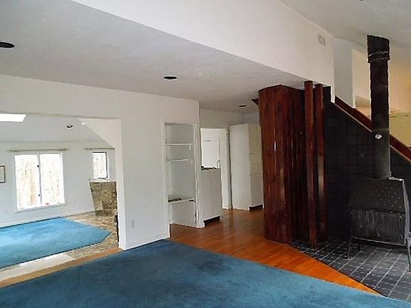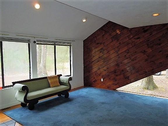 2+ acres of lush, wooded privacy is the setting for this 1970's Doug Sickle Contemporary! True contemporary with cathedral ceilings and walls of windows. Title V approved, new heating and Central air 2017. Great room with wet bar and marble flooring. Game room comes complete with Jacuzzi style tub and room for a pool or ping pong table...looking out into a beautiful natural setting. Home needs some work and updating but the location is incredible. Detached garage. All appliances remain.