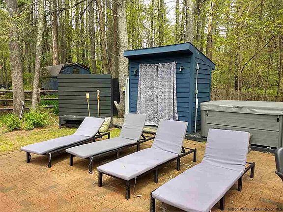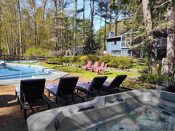 This move in ready, light filled, renovated contemporary home makes it easy to relax and enjoy your time together. It has everything you need to entertain your family and friends. Enjoy swimming in the in-ground heated pool with out door shower, or soaking in the new hot tub while your kids play on the playground or shoot baskets on the paved driveway. If you feel like a nice walk or a jog just step outside your driveway and enjoy a one mile loop or drive a few minutes to the nearby rail trail. The house is spacious with an open plan living room/dining and an eat in kitchen with large skylight. There are three ample bedrooms on the main floor with two bathrooms. The master bath is bright with a skylight and has a large six foot soaking tub and shower. The entire main level has recently installed wood floors throughout (except for tile in the bathrooms). The lower level has tile floors throughout and two additional bedrooms and a large mud room with new front loading washer and dryer. The garage has been turned into an entertainment area with putting green, ping pong table and dart board. Available fully furnished for an additional cost. Located only 2 minutes to the center of Woodstock. Agent is owner. Statue of woman doe not stay with the house.