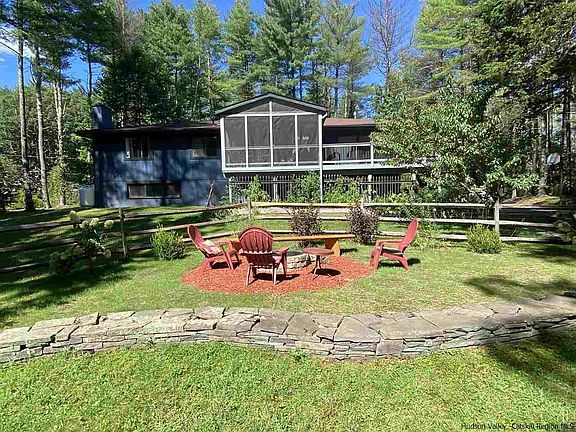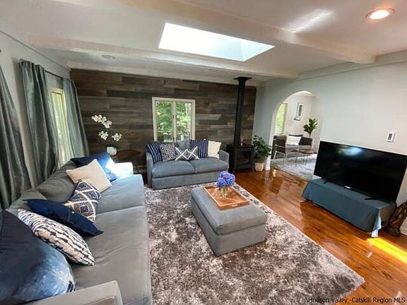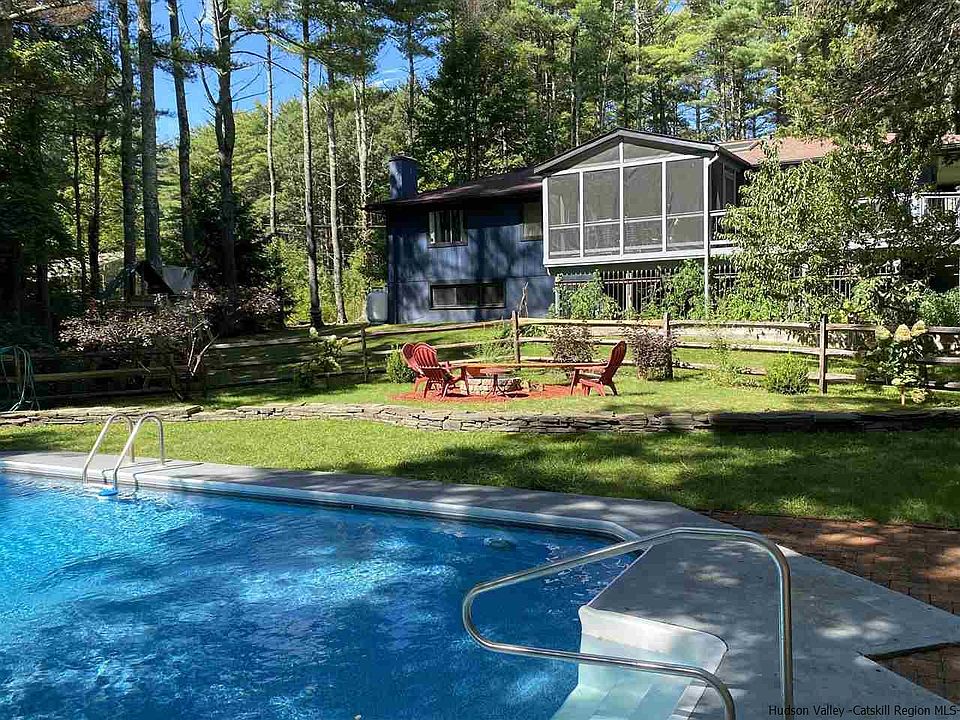 Come and enjoy this light-filled, renovated contemporary home. The updated open plan makes it easy to relax and enjoy your time together; it has everything you need to entertain your family and friends. Enjoy swimming in the newly converted saline in-ground heated pool with outdoor shower, soaking in the hot tub, roasting marshmallows in the new fire pit, climbing on the playground, or shooting baskets on the paved driveway. If you feel like a nice walk or a jog just step outside your driveway and enjoy a one mile loop or drive a few minutes to the nearby rail trail. The house is spacious with an open living room/dining and eat-in kitchen with large skylights and newly updated bar area. The entire level has wide-plank pine floors. There are three ample bedrooms with two bathrooms. The primary bath is bright with a skylight and has a large six foot soaking tub and separate shower. The lower level has tile floors throughout with two additional bedrooms and a large mud room with front loading washer and dryer. Some recent improvements include Solar panels (lease) and Tesla Powerwall backup battery (like a generator, but electric), EV car charger in garage, mini split AC and heat pump units added throughout house. Extend your seasonal enjoyment of the screened porch with new heaters. Located only 2 minutes to the center of Woodstock. Sellers are open to conveying the house fully furnished for an additional amount. Full list of recent improvements in associated docs. Radon mitigation system located in garage. Highest and Best due by 10/13 by 5pm.
