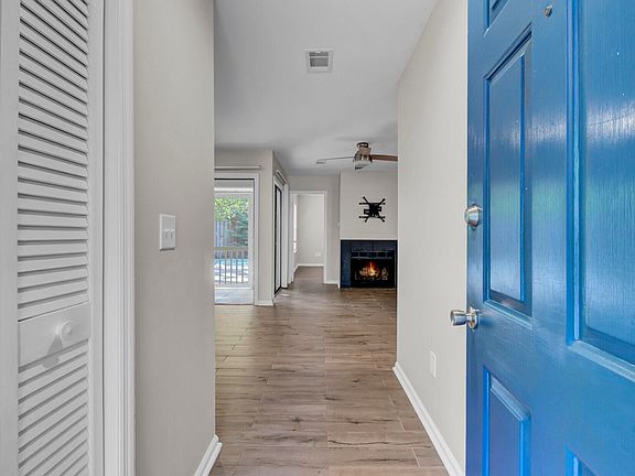Experience effortless condo living in this inviting home! Step through the front door into a cozy living room featuring a wood-burning fireplace and picturesque backyard views. The updated kitchen boasts stainless steel appliances, quartz countertops, and a charming bay window - ideal for a breakfast table and morning coffee. Enjoy the elegance and low maintenance of porcelain wood tile. Two spacious bedrooms offer comfort and privacy. The primary bedroom features a quartz vanity, upgraded lighting, and a large walk-in closet. Outside, a screened-in patio overlooks a paved backyard perfect for entertaining. Additional features include a private shed, a laundry room for added convenience, and two assigned parking spots conveniently located in front Located in the desirablePlanters Walk townhome community, enjoy access to a refreshing pool. Within the larger Crowfield subdivision, discover miles of scenic walking trails, a serene lake, a library, and a public golf course. Don't miss out on this exceptional condo - schedule your private showing today!