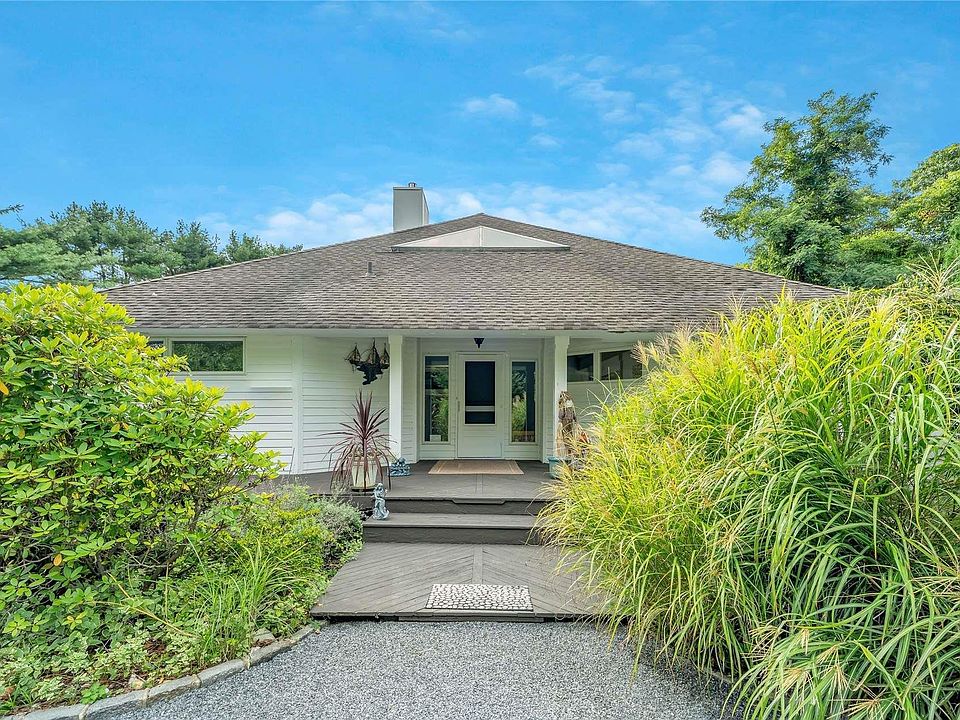 Remsenburg Custom Post Modern Home. No traffic! As this home sits in the westernmost hamlet of Southampton Town. Low taxes. Many updates. Beautifully landscaped private 1.4 acre property abuts 26 acres of preserved waterfront land. Located on a quiet cul-de-sac this home has an amazing entry foyer with cathedral ceiling, sitting area with a gas fireplace, large living room, powder room, new kitchen with island, dining area, 2 en suite bedrooms on the main level and a covered deck area off the kitchen. Primary suite with cathedral ceiling and private balcony on the second floor. Large gunite pool with deck and hot tub, partially finished basement with den, cedar closets, bilco door and unfinished area. Right of Way sandy beach with amazing sunset views., Additional information: Interior Features:Lr/Dr