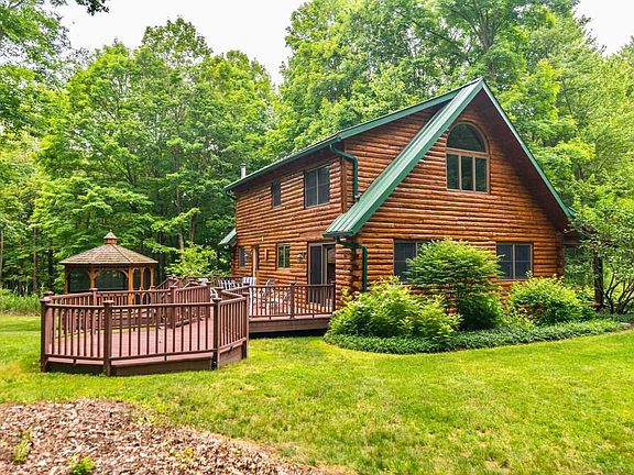 Serene, private retreat completely move-in ready. This three-bedroom log home is nestled nicely at the end of a private road in Clinton Corners, NY. Wooded, yet landscaped with mature perennials and lawns, the grounds are inviting the moment you arrive. Inside, the open floor plan with cathedral ceiling includes a living room with stone wood burning fireplace, dining area with glass sliders leading out to large deck and breakfast-bar eat-in kitchen with stainless appliances and porcelain country sink. A bedroom and laundry room are also on the main floor. There is wide board pine flooring and tongue and groove paneling throughout. The master bedroom with ensuite spa/bath and bedroom/loft are on the upper floor. Back outside, there are two large decks including a screened gazebo and three car garage. Convenient to the Taconic State Parkway and minutes away to Rhinebeck, Millbrook, Sharon CT, and more. Nearby Metro North train at Wassaic and Poughkeepsie. Amtrak at Rhinecliff. This is all just 90 miles from NYC. Welcome to the Hudson Valley.