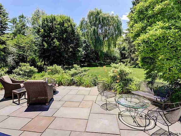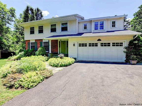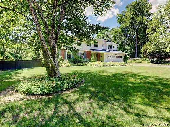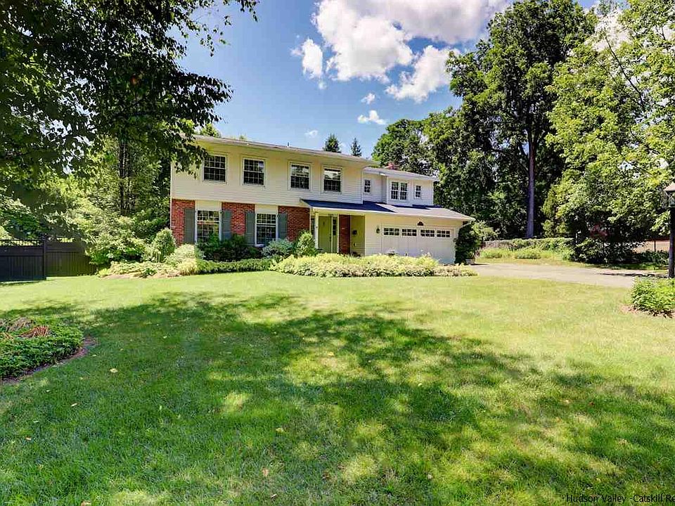 UPTOWN KINGSTON AT ITS BEST: Golden opportunity to own a beautifully maintained 1960s charmer on a 1-acre park-like parcel in Uptown Kingston. Totally private dead-end street, yet an easy walk to weekly farmers market and happening restaurants, bars and boutique shops in the Historic Uptown Stockade Area. For NYC commuters, it's just five minutes to the Trailways bus station. Completely fenced back yard keeps the dogs in and the deer out, with a stream and mature professional landscaping throughout. Gorgeous perennial beds bloom sequentially from spring through fall - daffodils, lilies, hydrangeas, hostas, peonies and roses. The level and flat back yard has all-day sun and ample room for a pool. An expansive bluestone patio runs the full width of the house. Lots of mature specimen trees here, including willows, Norway spruces and magnolias. 19 Lounsbury Court in Kingston features a stepped front entry, classic wood shutters and brick facing accented with a carriage-style garage door, and gracious bluestone walkways. The house has great flow, in every season. Entertain a large group of friends for a summer barbecue or enjoy a cozy TV night at home by the fire. The first floor has the feel of a classic Colonial, with a living room that offers large windows, custom built-ins and a bright eastern exposure - just the spot for a morning cup of coffee. The adjacent formal dining room has French door sliders that lead to a lighted covered porch. SUPERSTAR KITCHEN: Architecturally designed and so well executed, with a large eating area, loads of storage, honed granite counters, hardwood flooring, and recessed and under-cabinet lighting. A wall of windows faces out to the patio and yard. Appliances include a Bosch built-in double oven with a warming drawer, Sub-Zero refrigerator with custom paneled doors and a Wolf 6-burner gas range with a custom overhead range hood. Step down into a cozy den with a top-of-the-line Jotul gas fireplace, exposed brick, and more built-ins and sliders that open to the bluestone patio. There is also a stylish first-floor powder room tucked behind the kitchen. The second floor holds three full bathrooms (all renovated), a linen closet and five dead-quiet bedrooms, including two master suites. The primary master, an addition, has a large walk-in closet and a bright sunny bathroom with double sinks, Kohler jet tub with tiled surround, separate shower with a glass door and a pocket door to the commode. Another wall of windows overlooks the very private yard -- wake every morning to wide-angle views of your own backyard paradise. The second master is currently being used as an architect's home office. Two bedrooms face out to the side yard stream. The finished basement offers a B-Dry system, a second refrigerator, loads of storage and a world of possibilities: gym, wine cellar, home theater, teen hangout, billiards, Ping Pong. The two-car garage has cement flooring, automatic doors and more storage. Lots of winning architectural and design details throughout - wide interior doorways, recessed lighting, built-ins, crown moldings, oak hardwood floors, sconces, and modern chandeliers and light fixtures. Other features include a burglar alarm, built-in speakers on the entire first floor as well as the outside patio area, five-zone heating and two-zone central air. This property has it all.