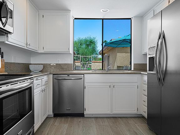 Available for lease, December 2022 through March 2023!! Updated 2 Bed / 2 Bath Granada Floor Plan with beautiful southeast facing mountain views overlooking the 16th Fairway. Located on one of the best locations in Sunrise CC. This bright and comfortable unit is located on the greenbelt but steps away from the fairway. You will love the stylish decor inside and out with the large living/dining area expands your view to the back patio and beyond to stunning mountain views. Imagine waking up every morning in this spacious primary bedroom with a king-size bed with great views. The primary bathroom has been updated with a large walk-in shower and walk-in closet. The guest bedroom has a queen size-bed and desk for those who need a quiet office space. Stainless Steel appliances in the kitchen that looks out to the gated front courtyard patio equipped with a BBQ for outdoor entertaining. This is truly a gem! Sorry, NO PETS. Tenant has a $125 per month utility allotment for Electric and Gas.