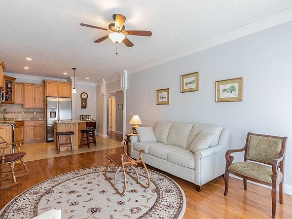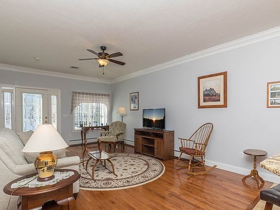 Only ONE owner! The view from the front door of this unit happens to fall between two end unit condos so there is a lovely view of the pond. This 12 year young single level condo is ready for you! Impeccably maintained and meticulously kept, simply move right in. Open concept kitchen/dining/living room, two full baths (one master), first floor laundry and two spacious bedrooms. Some of the bonuses include gleaming hardwood floors, fresh paint, upgraded kitchen with backsplash, central air conditioning, sliders to deck/patio, one car garage and enormous front to back basement with soaring ceiling for storage or easy to finish for additional living space. Entire complex set on scenic Bent's Pond, close to area amenities, shopping and restaurants. 55+ Adult Community.