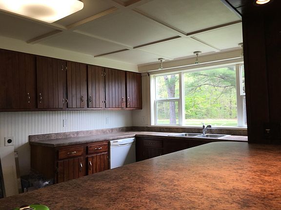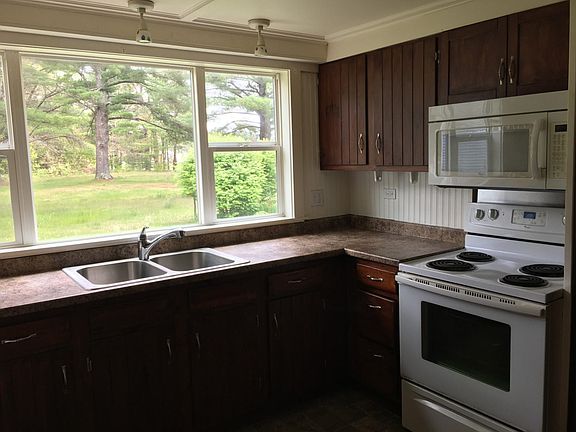 Large 6.11-acre lot! This village home is situated on a a level lot with 512' of frontage on Main Street. The 6-room home has a large surrounding yard area, with tall Pine Trees in back. Beyond the tree line in back there are wetlands that extend to 177' frontage on Birch Hill Road. A Major snowmobile trail crosses the property. The building has a renovated kitchen featuring a large picture window overlooking the side yard, an eat-in counter & wood cabinets. Features in the living room include a large picture window facing south & a heat-a-lator stone fireplace, that would need inspection by a professional & possibly a flu insert for a wood stove. The separate dining room has a hard-pine floor & a built-in cabinet for your dishes. One smaller bedroom also has a built in cabinet for linens and storage. The larger bedroom has an smaller side room that could serve as your home office or as a nursery for a new born. The Seller carried out a full renovation of the full bathroom; a door in the bathroom leads to the utility room, with space for the propane gas furnace, the electric water heater & water treatment tanks. The pressure tank for the drilled well is located in a crawl space under the house. There is a pull-down set of stairs to the unfinished attic above; there is good head-room in this attic space. In addition to the 22' x16' single car garage, there is also a 16' x 12' shed for storage. You will love the privacy of this large lot. Being Sold As Is !