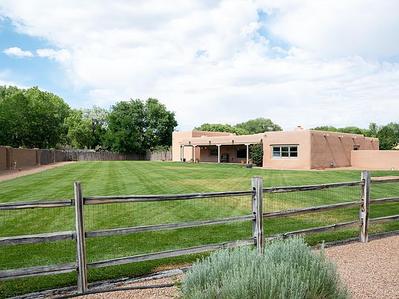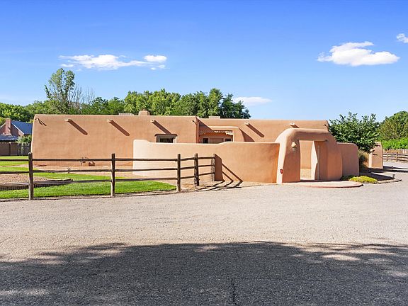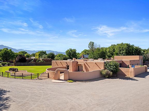 Welcome to this one of a kind timeless ADOBE home nestled on 1 acre in the green belt of Corrales village. This 3990 square foot residence offers authentic charm and breathtaking unobstructed VIEWS. expansive outdoor patio & large windows w/ natural light! En Suite/mini master or in law quarters, w/ private lush courtyard & stamped brick design. Brick floors throughout, radiant heat, and plaster diamond finish. Two living areas, double sinks in bathrooms and Alderwood cabinetry in the kitchen, this home is designed for spacious and comfortable living. The property also features 1402 sq. RV garage plus 3 car & heated Harley garage or Artist Studio. Brand new TPO ROOF. Enjoy the newly renovated courtyard w/ stamped brick design. Chef's kitchen w/ wine cooler & Granite counters, Call TODAY