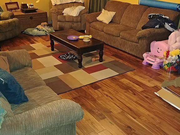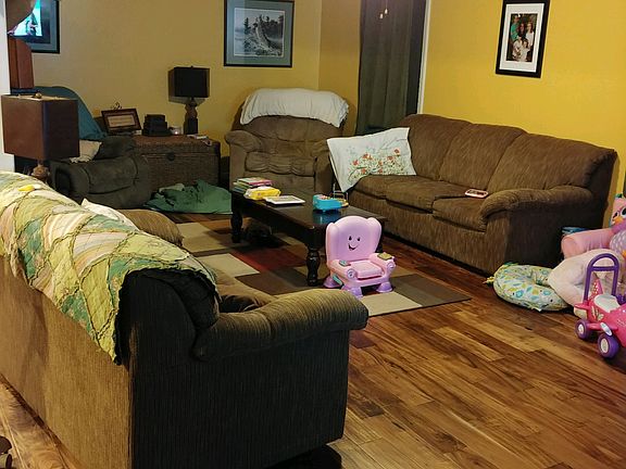 3 bedroom 2 bathroom home with new acacia handscrapped hardwood throughout the living, kitchen, dining and laundry area. (Added in April 2018). Beautiful front flower beds and front porch. Also has back deck. Big kitchen with island and lots of cabinet space! Great neighborhood and quiet cul de sac.