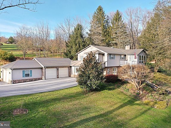 Enjoy this unique 4.9 acre property in Jacobus Borough with easy access to I-83. Located at the end of a public road it is private and serene. The land is half wooded and has a stream, pond with water feature, detached 2 car garage/ workshop and areas of native and perennial plantings. The house containing 3 bedrooms, 3 full baths, 2 kitchens , den, large family room with indoor garden, attached fully insulated 3 car garage and spacious patios is great for hosting family gatherings and entertaining.