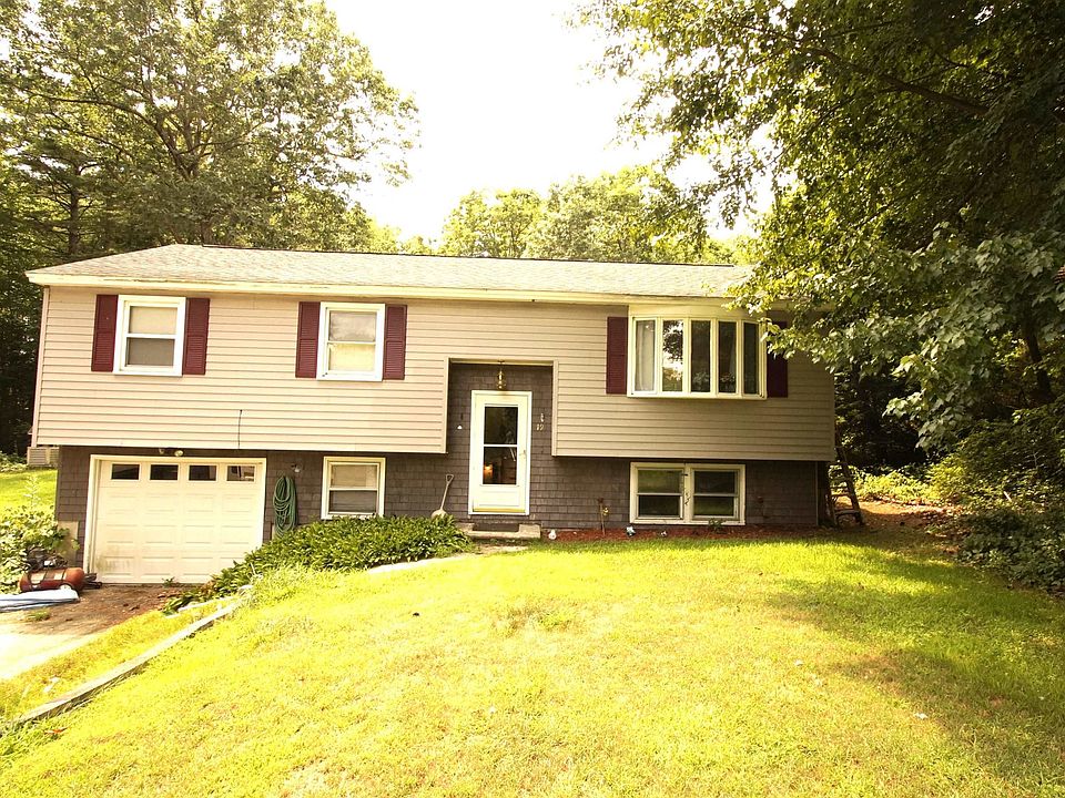 8 room raised ranch, 4 bedrooms, 1 & 3/4 baths. Private 1 acre yard located at the end of cul-de-sac abutting conservation land. Eat-in kitchen has newer oak cabinets, granite counters, travertine tile floor, stainless appliances and an granite island with 2 bar stools. The dining area has a slider out to the oversized deck and above ground pool situated in private back yard surrounded by mature oak trees along property boundaries. The carpeted living room has a bow window (needs replacement - seller offering $3,000 replacement credit) and a brick-faced wood burning fireplace. Front entry has oak stairs to upper & lower levels. The lower level offers a light-filled family room with 2 windows, a wood stove hookup, tall 8 foot sheetrock ceiling, carpeted floor. Lower level also includes the 4th bedroom, an additional finished room for home office/storage PLUS a 3/4 bath/laundry room-with newer washer/dryer included! 1 car garage under ,2 zones of FHW propane heat. 8 foot ceilings on both floors, pull-down stair attic access. Maintenance free aluminum siding, vinyl replacement windows. Town water. Leach field in front yard replaced in 2000. Ready for your renovations/personal touches with upgrades/renovations needed. In-town schools: Griffin Elementary school 2.6 miles, middle school 2.4 miles and high school 3.5 miles. Manchester airport 15 miles, Nashua 8 miles, 12 miles to route 3 Merrimack.