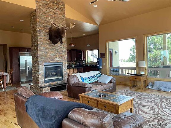 Incredible custom lake retreat with the most amazing view of Glendo reservoir. This spacious and inviting home features Hickory floors, solid doors and trim and a gourmet kitchen. You will love the sunny great room with floor to ceiling fireplace and mesmerizing view. The large primary suite has a luxurious bath with split double vanities, walk in shower and spa tub plus a custom closet. The walkout basement is finished with wet bar and recreation area with access to the covered patio, fire pit.