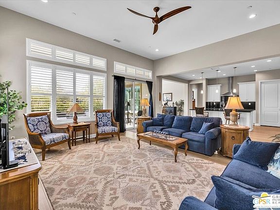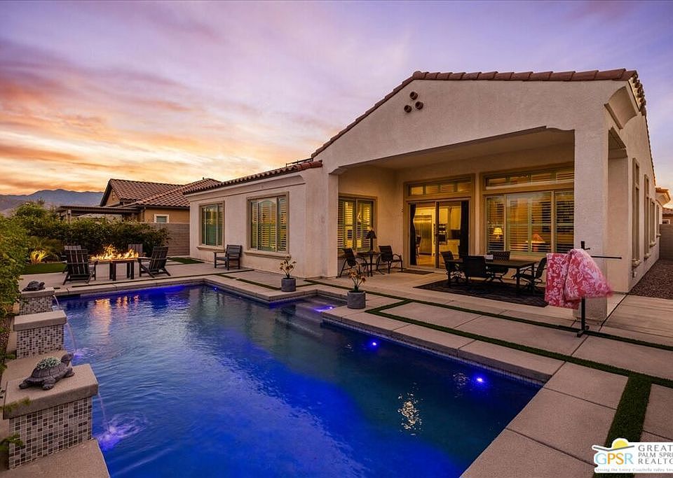Welcome to your private retreat in the heart of Del Webb's sought-after 55+ community. This beautifully appointed 3-bedroom, den and 2-bath home - Encore Series Plan 8, Spanish Serenity - blends upscale comfort with timeless design, offering a lifestyle of relaxation and refinement. Step inside to discover luxury vinyl plank flooring, custom plantation shutters, and designer ceiling fans throughout, setting the tone for an elegant and cohesive interior. The gourmet kitchen is a chef's dream, featuring a KitchenAid Professional Series appliance package with a built-in refrigerator, 42-inch upper cabinets with crown molding, striking black granite countertops, a full granite backsplash, and a large executive island with ample storage and seating - perfect for entertaining or casual meals. The kitchen flows seamlessly into a spacious family room with soaring 12-foot ceilings and a sunlit dining area adorned with a stylish fandelier, all designed to enhance natural light and open-concept living. Utilize the den as a formal dining room or bonus space for arts and yoga. Retreat to the primary suite, a peaceful haven with an ensuite bathroom featuring dual vanities, a walk-in shower with bench seating, and a generously sized walk-in closet. A private guest wing on the opposite side of the home includes two additional bedrooms and a full bath - ideal for hosting overnight guests or creating a home office space. Step outside to your covered patio and take in the serene views of your professionally landscaped backyard, complete with expanded hardscape, softscape, a custom gas fire pit, and your own private pool - an oasis for year-round enjoyment. Additional highlights include a spacious laundry room with abundant cabinetry and a utility sink, a convenient built-in shoe station, and an oversized 2.5-car garage with epoxy flooring and room for storage or a large vehicle. As a resident of Del Webb's premier active adult community, you'll have access to world-class amenities including a clubhouse, resort-style pool and spa, state-of-the-art fitness center, tennis courts, pickleball, and an array of social activities tailored to your interests. This is more than a home - it's a lifestyle.