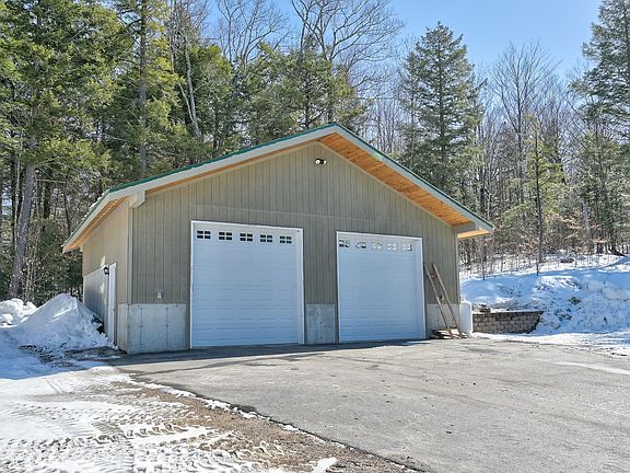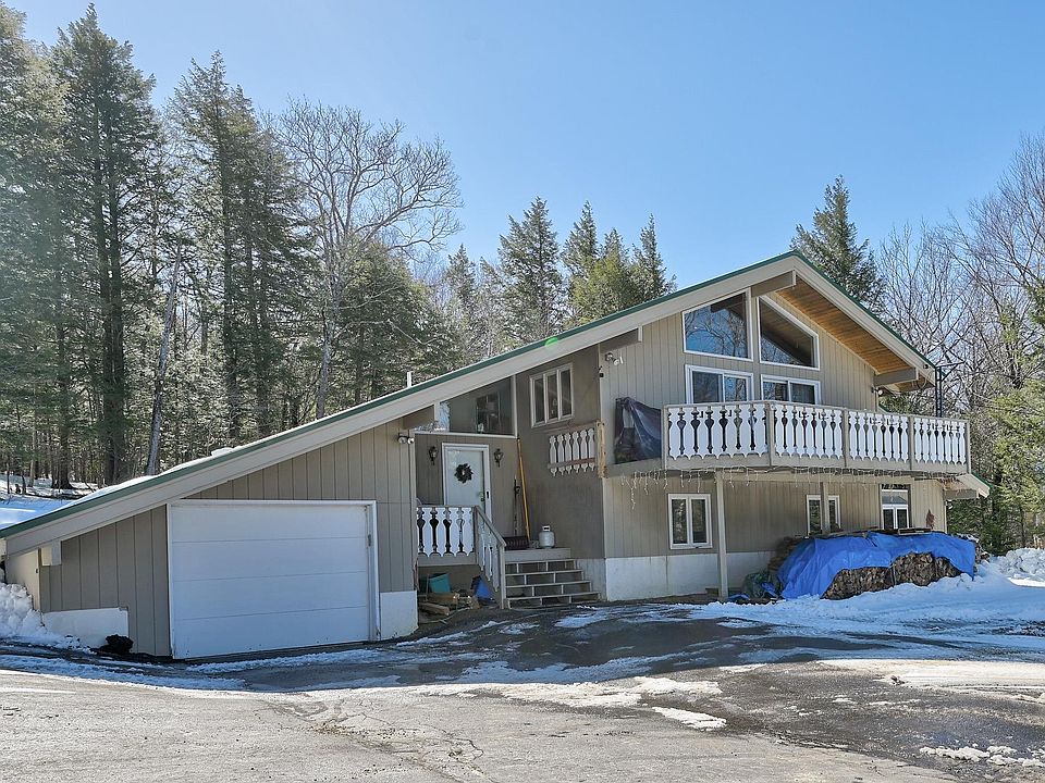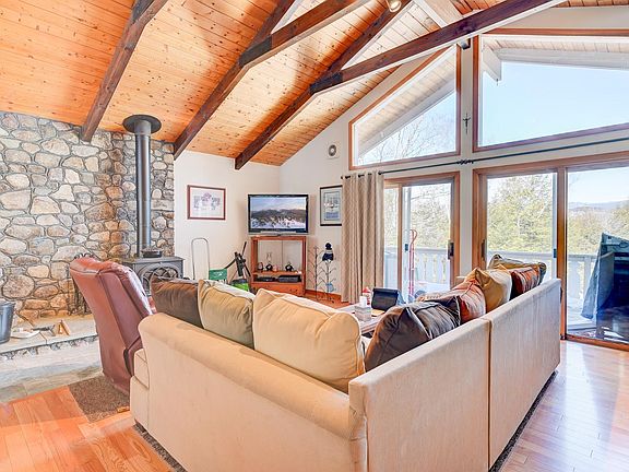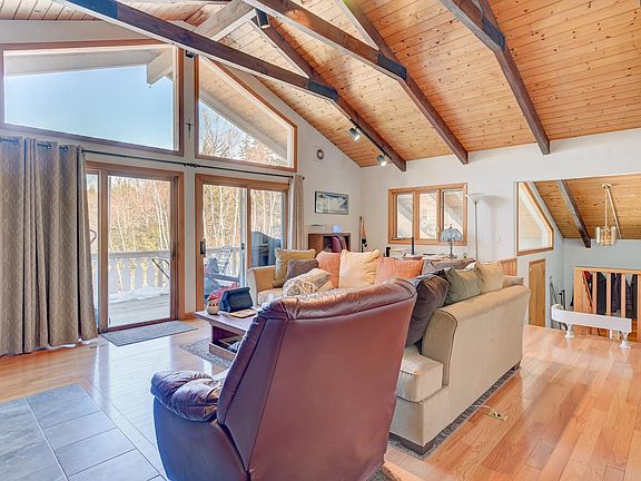 Spectacular sunset views to Mount Washington at this oversized chalet in Bartlett’s desirable Linderhof neighborhood! The entry level has mudroom storage, a full bath, laundry room, and bonus sunroom with large windows and a sauna. Upstairs on the main level is the open concept kitchen/dining/living space that is bright and airy with cathedral wood-beamed ceilings, double glass sliding doors out to the deck, and a cozy wood stove on a stone hearth. The custom kitchen has tons of natural wood cabinetry storage, granite countertops, an eat-in peninsula, and stainless appliances. The dining area off the kitchen has a balcony overlooking the lower level secondary living room, accessed by the spiral staircase. This large living space has impressive floor-to-ceiling bookshelves, perfect for readers or collectors, and a large array of windows looking out to Mount Washington, another wood stove, plus a door leading outside. The lower level is home to the three nicely-sized bedrooms, including the primary with shared access to the full bathroom. A one-car garage is attached to the home, and there’s a detached 2-car garage for storing vehicles, tools, and toys. Enjoy the fenced-in garden for those with a green thumb, plus a detached shed. Just 10 minutes to Attitash Mountain, and 15 to the shopping, restaurants, and recreation of North Conway!