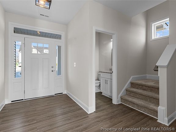 Builder Price Reduction. Phase Closeout! This custom-built beauty offers a perfect blend of style and functionality. Step into the inviting entrance foyer featuring a convenient half bath and closet. The heart of the home is the expansive family room, featuring a cozy electric fireplace adorned with custom wood shelving. Adjacent is the open kitchen complete with granite countertops, a kitchen island, and just enough cabinet space. Convenience meets establishment with the mudroom off the garage, equipped with a bench and cubbies. Upstairs, discover three bedrooms, including the master suite presenting a spacious layout, complemented by a master bath having a double vanity, walk-in shower, rejuvenating garden tub, and a generously sized walk-in closet. Efficiency is key with the upstairs laundry room, outfitted with wire shelving and cubbies for easy storage and organization, along with an additional hall closet. Step outside onto the deck and enjoy the surroundings.