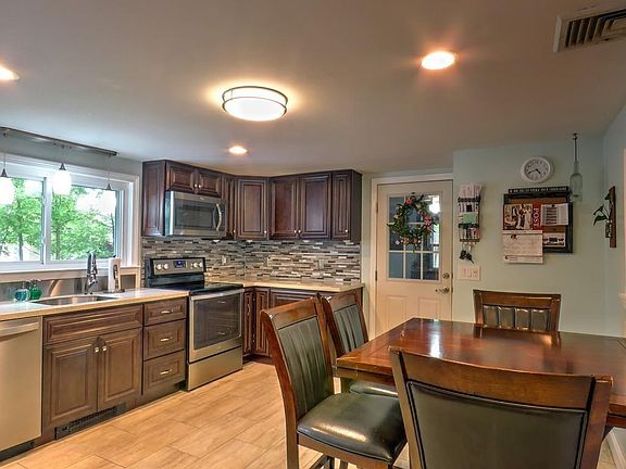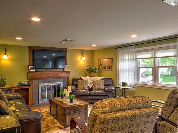 This one is truly a pleasure to show! Pride of ownership. Updated and improved inside and out. Fantastic curb appeal with vinyl siding (1 year old), cedar impressions on front, and architectural shingle roof (5 years old). Replacement windows. New interior and exterior doors. Kitchen was gutted and rebuilt 2 years ago with ceramic tile floor, recessed lights, stainless appliances, glass tile backsplash, and solid surface counters. Master bedroom has 2 double closets, all bedrooms have ceiling fans. Hardwood floors in fireplaced living room as well as all bedrooms. Beautiful tile work in the renovated bathroom. Lower level has a family room, half bath, and laundry closet. The unfinished side of the basement has utilities and a workshop area. The boiler is approximately 7 years old. 100 amp electric with breakers. Central A/C. 1 car attached garage. 12x30 deck overlooks back yard. Easy highway access for your commute. Showings to begin at open house this Saturday and Sunday from 12-2