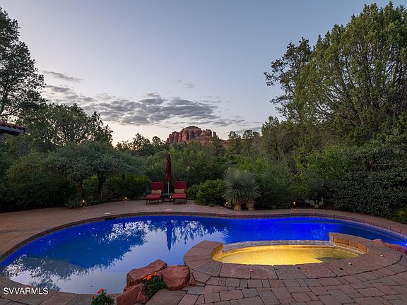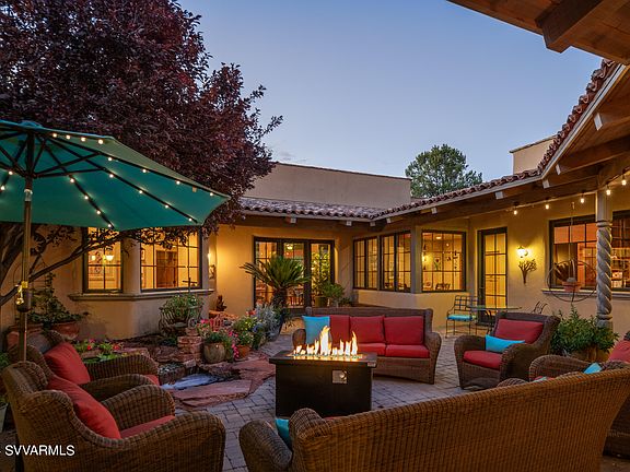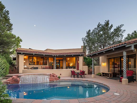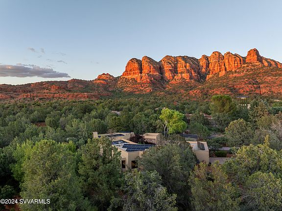 Welcome to Hacienda de los Suenos, a stunning furnished 3,810 SqFt architectural masterpiece on a wooded acre with breathtaking VIEWS of Cathedral Rock. Highlights include hand-distressed pine floors, 1870's India Palace entry gates, and 1880's Kentucky church stained glass windows. The gourmet kitchen features custom cabinetry, granite island, and top-tier appliances. Enjoy a state-of-the-art home THEATER, pottery STUDIO, luxurious GUEST CASITA, and a saltwater POOL, SPA + Solar Heat. The master suite offers a gas fireplace, whirlpool tub, and scenic woodland views. Improvements: new roof (2020), appliances and HVAC systems (2021), paved driveway (2022), solar panels (2023), and new pool filtration (2024). Nestled in GATED Highland Estates, this home blends elegance with natural beauty Hacienda de los Sueños Overview... Furnishings & Housewares Available On Separate Bill Of Sale Total Square Footage: 3,810 SqFt Builder Plans Square Footage (Main/Guest House): 3,160 SqFt Pottery Studio: 170 SqFt Pool House: 480 SqFt 5 Bathrooms: (one with a bidet & - 4 walk-in showers) Builder: Ethan Foster Architect: Bob Woods Completed Construction: October 4, 2004 (Original Owners) Acreage: 1.02-acre parcel located in a wooded, quiet, private gated community Solar: 40 solar panels Parcel: 405-26-030 KEY FEATURES: - Signature hand-distressed wide plank pine flooring - Casement windows and solid core doors - High wood ceilings with beams - Concrete window sills from Tlaquepaque forms - Taos twisty poles and authentic Mexican tiles on overhang roofing - Designer ceramic tile and fire suppression system - Superior flat roof process - Ceramic tile flooring; carpet in theater - Three fireplaces - Two buried propane tanks - Two gas hot water heaters (main house replaced in 2022) - Two HVAC and two splits (one HVAC replaced in 2021; two splits replaced in 2022) ARCHITECTURAL HIGHLIGHTS: - Arched 1870's India Palace entry gates into a large central courtyard - Arched 1880-1890's Kentucky church stained glass windows in the living room - Stucco wood-burning fireplace - Recurring arches in courtyards, doors, hall entries, theater, master bath, dining room, and landscape walls - Gated, landscaped entry courtyard - Central courtyard with 1870's India Palace gates, Taos twist columns, Hacienda style roofing with Mexican tile, trees, water feature, and safe outdoor space for pets PRACTICAL FEATURES: - Recirculating hot water and central vacuum - Water softener, and instant hot water - Natural wooded setting with abundant wildlife - Planted plum trees, Arizona cypress, Blue Ice cypress, apple trees, pomegranate tree, pines, cactus, Apache Plume, and Southwest and Russian Sage - Wood blinds in library, master bedroom, casita, and bonko - Chip seal flooring in garage and pottery studio (2021) - Fire sprinkler system KITCHEN: - Newly resurfaced custom cabinetry with 28 drawers (2021) - Bosch dishwasher, Sharp warming drawer microwave/convection oven, gas cooktop, Dacor warming drawer - French door style refrigerator with craft ice and exterior dairy drawer - Hand-thrown pottery veggie sink, instant hot water, granite island, tiled counters - Walk-in pantry with small fridge ADDITIONAL SPACES: - Dedicated home theater with 4K high-definition picture and surround sound (audio/video replaced in 2020), 8 recliners, custom cabinets, bar sink, microwave - Heated and cooled pottery studio with kiln, flat roller table, extruder, deep sink with clay trap, work counter, and display shelves - Guest casita with wood-burning kiva fireplace, custom cabinetry, walk-in shower, whirlpool tub, and garden views - Gallery hallway with bonko for reading or sleeping - Master bedroom with see-through gas fireplace, whirlpool tub, walk-in shower, antique cabinet with sink, and stained glass of the Grand Canyon - Utility room with tiled counters, custom cabinetry, pull-down ironing board, porcelain deep sink, and TV - Sunroom with wainscoting and banks of windows - Library/office with windows on three sides and custom shelves - Laundry room adjacent to master closet with washer/dryer (2021), porcelain deep sink, tile counters, custom cabinets, pull-down ironing board, TV OUTDOOR FEATURES: - Saltwater pool and hot tub with solar heat (3-7 feet deep) - Party pool house with bar, bath with walk-in shower, bronze eggshell sink, daybed, storage closet with full fridge. Hacienda style roofing with Mexican tile and Taos twist columns - Rear terrace with Hacienda style Mexican tiled roofing, Taos twist columns, built-in grill on tiled bar, swing with Cathedral Rock views COMMUNITY: - Gated community of Highland Estates with friendly neighbors - Annual fee of $925 for community services like landscape clean-up, maintenance, and social events MAINTENANCE & UPGRADES: - 2000: New roof with 30-year warranty - 2021: New hot water heater, new appliances (except warming drawer and dishwasher), three of four HVAC systems, new kitchen cabinet framing, resurfaced kitchen cabinets, epoxy chip seal of garage and studio floor - 2022: Paved driveway - 2023: Installed 40 new solar panels ($27,577), renovated courtyard water feature, complete exterior painting ($22,000) - 2024: New saltwater pool filtration system ROOMS: - Living room with 1870-1880's Kentucky stained glass windows, fireplace, Cathedral Rock view - Dining room with Cathedral Rock view - Entry hall closet - Gallery hallway with bonko - Kitchen with custom cabinets resurfaced in 2021, pantry with beverage refrigerator, drawer microwave/convection oven, Dacor warming drawer, pottery veggie sink with instant hot water, Cafe style refrigerator with dairy drawer and craft ice, quiet garbage disposal, tile counters, granite island, and Cathedral Rock views - Breakfast sunroom with wainscoting and windows overlooking courtyard - Library/office with extensive custom shelving - Two bedrooms with options for two more, sitting areas with fireplaces