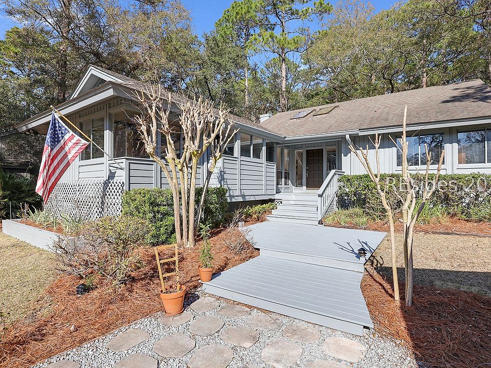 Tucked away on desirable Newhall Road in Sea Pines, this 3BR home offers a wonderful combination of privacy and opportunity. Backing directly to the Newhall Forest Preserve, the setting is quiet, peaceful, and free of through traffic. A large rear deck with an elevated pool overlooks the natural, wooded landscape, and a spacious Carolina Room (approx. 16' x 19', not included in stated square footage) provides excellent additional living space. Offering an eat-in kitchen, office, formal dining space, a recently painted exterior, and a detached two-car garage. The interior has not been renovated and will appeal to buyers looking to update and customize in one of Sea Pines' most sought-after streets in the Club Course area.