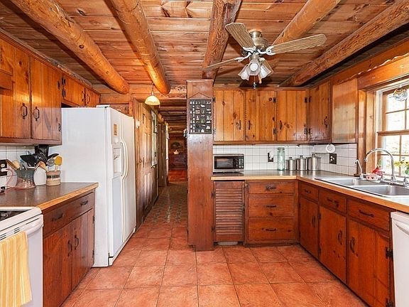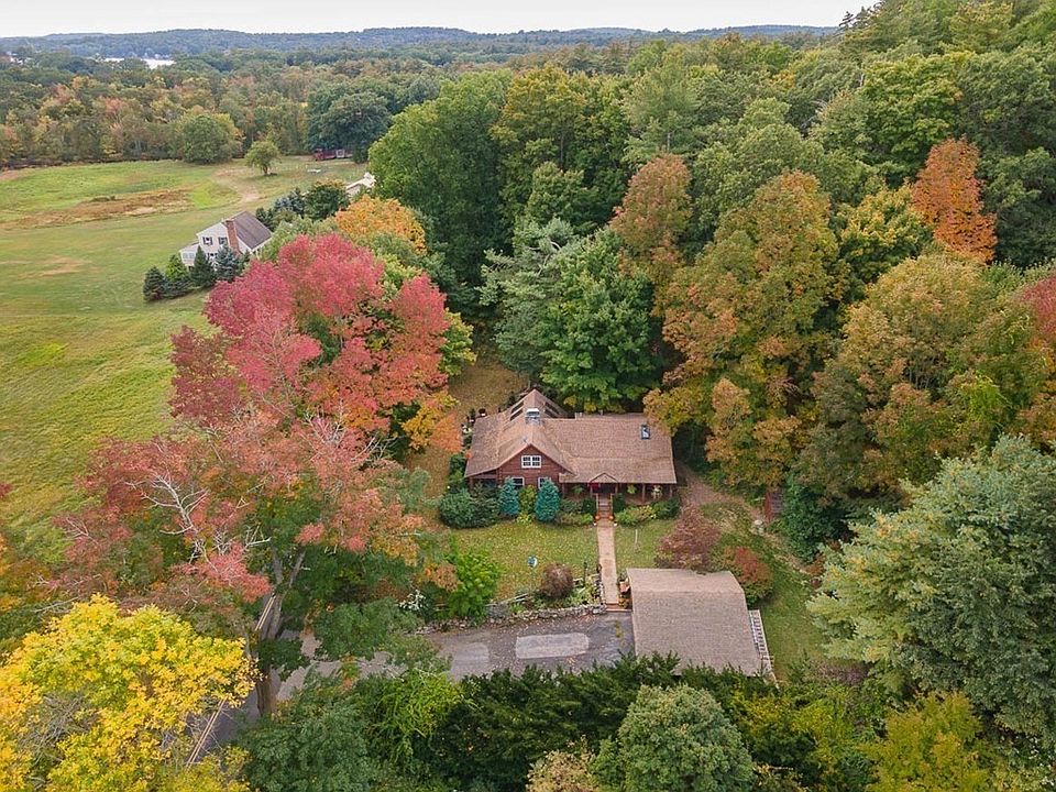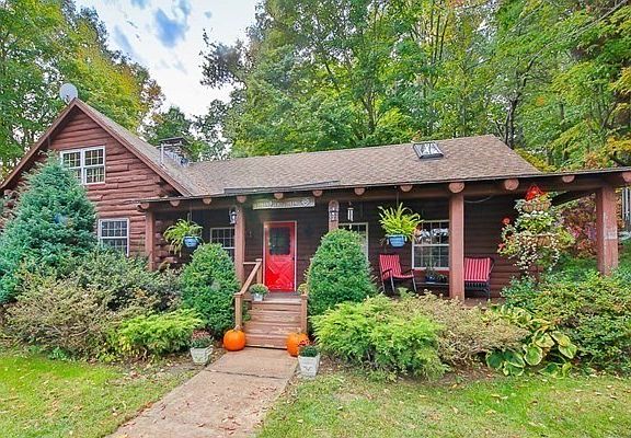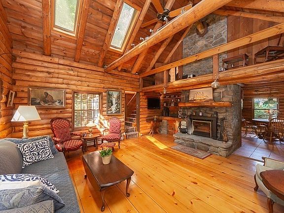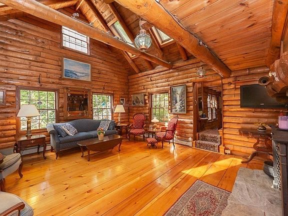 ESTATE SALE - Absolutely charming and enchanting Log Cabin Cape nestled on a knoll in beautiful country setting near the 365 acre Woodsom Farm Conservation Area and Trails with mature landscaping, Koi pond and lovely plantings. Wonderful yard and grounds offer Zen-like gardens, natural screening and privacy, yet views of open fields and farmland are still visible. You will be transformed when entering this quaint and bucolic sanctuary with its warm exposed natural logs and post & beam construction. The living room is reminiscent of a mountain lodge with its cathedral ceiling, skylights, wide pine floors and stone fireplace. There is also a large screened-in porch, partially finished basement with fireplace and a detached two car log-style garage to complement this fine property.