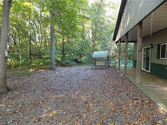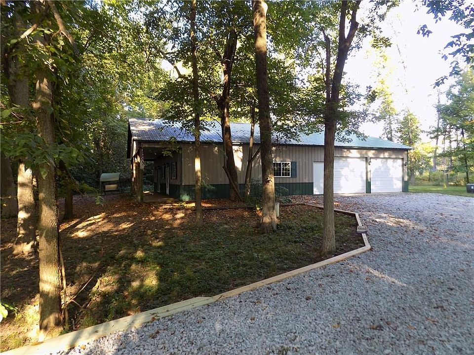 Pole barn style house tucked away in the woods! From the moment you pull down the wooded drive you get that cozy feel. Built in 2006 with a 27x45 attached 2 car garage. Garage has a loft for extra storage, concrete floors w/ a drain and maintains a comfortable temperature year round. Living quarters is approx 1,215 sq ft w/ special vinyl flooring from England throughout the whole house. Large rooms with oversized doors that are handicap accessible. Large living room open to the kitchen with a breakfast bar and all appliances to remain including the washer/dryer. Covered front porch overlooking a park like wooded area with lots of squirrels & chipmunks running around. The back of property provides a pasture area if desired, 5+ acres total.