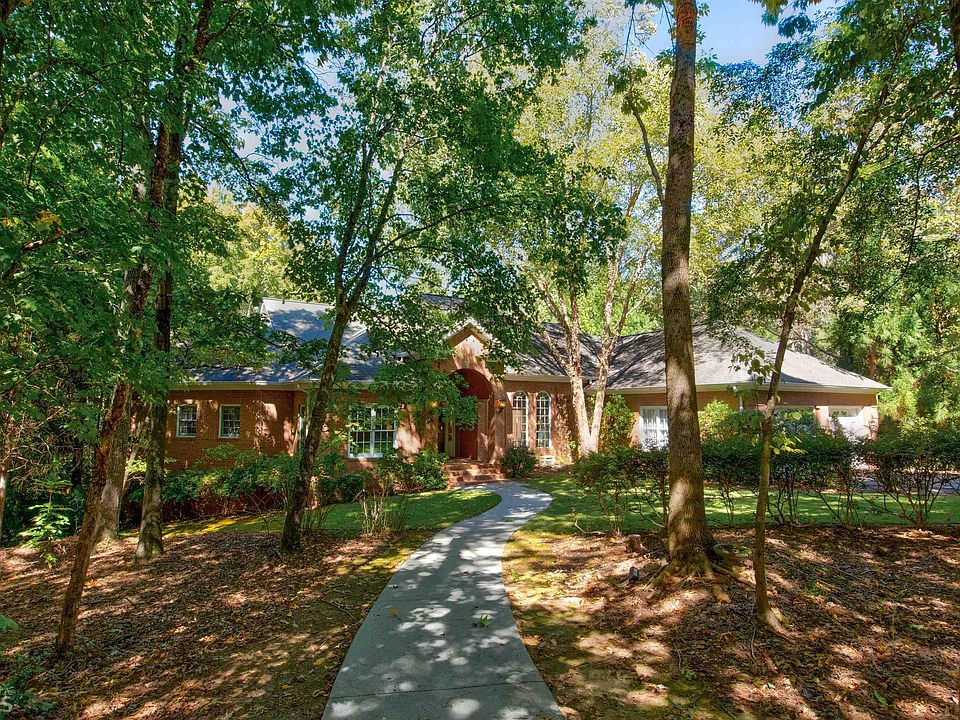 Magnificent One Level Executive Style Brick home on +-3.66 private acres in The Polo Fields community. This one of a kind custom home boasts 10 to 14' ceilings through out, open floor plan Kitchen/Den/casual dining with island, 3 Bedrooms on Main plus office which could easily be converted to 4th bedroom, 3 full baths. Lots of natural light with upgraded windows, lots of transoms and large rooms, floor plan flows nicely for entertaining or for larger family gatherings. Brick floor covered porch overlooks beautiful gunite pool.