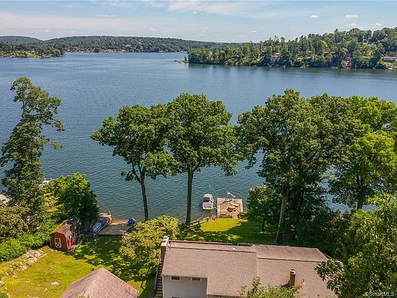 *Spectacular* Wide Water Views! Fabulous waterfront weekend getaway or year round charmer from your childhood memories! Candlewood comes alive in the Summer time, so delight in boating, tubing, water- or jet skiing, swimming, fishing, kayak and canoeing - whatever your outdoor pleasures may be! Enjoy BBQ's on the patio, watching fireworks on the 4th of July, toasting marshmallows, late nights on the lawn stargazing and catching fireflies... Time to relax and unwind! Great room with vaulted ceilings, exposed beams, lg. stone fireplace and a wall of glass/sliders to deck, showcasing the lake! Finished lower level family room for indoor fun with pool table, wet bar, 2nd fireplace; sliders to covered patio, rolling lawn! Unfinished storage/workshop cellar w/ slop sink (fishing!), addt'l. half bath, opens to yard. When the weather's cooler, cozy up in front of the fire with your favorite hot beverage, enjoying the fabulous Autumn foliage and tranquil Winter views of the lake. Ice skate, ice fish, build the perfect snowman. You *can* have it all! Ramp at waterfront for personal watercraft. Oversized 2-car detached garage w/ attic above is right by the front door. Parking pad above circular driveway for additional guest or boat space. Pristine lake views from just about every room in the house, from the deck, patio and cement dock w/ slide. Less than 90 mins. from Manhattan. Relax, unwind and enjoy all that Candlewood Lake has to offer... Welcome to the Lake House!