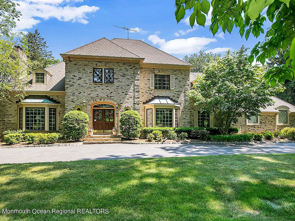 Located on one of the prettiest streets in Colts Neck is this elegant all brick 5 bed, 4.5 bath Colonial with resort-like backyard. Finely appointed estate offers 2 fireplaces, decorative moldings, wood floors, French Doors, bay, bow & Palladian windows. Bright & open foyer greets you home. Impressive Great Room features rustic stone fireplace & wet bar. Large eat-in kitchen has butler's pantry & slider door to patio. Graceful living room is warm & welcoming. First floor also has sophisticated dining room with beautiful wainscoting, den/ bedroom, home office & laundry room with sink. Spectacular sunroom is truly a showstopper & is surrounded by a wall of windows with breath-taking views. Fabulous primary bedroom offers primary bath with soaking tub & double sinks. All bedrooms are generous in size, tastefully designed & has ample closet space. The resort-like backyard will impress the most discriminating buyer boasting of gorgeous paver patio with awning, built-in stone BBQ, sparkling pool all amidst immaculate landscaping & lush greenery. This fabulous home also has large 3 car garage & partially finished basement with endless possibilities. Living in Colts Neck offers a great sense of community pride & is close to beautiful horse farms, beaches, golf courses, parks & NYC transportation.