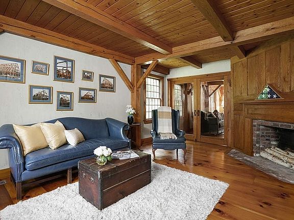 - Liv Dscrp: Fireplace, Main Level, French Doors, Flooring - Wood, Ceiling - Beamed
