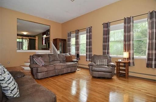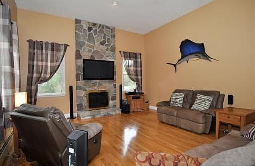 Wonderful Multi-level home with open floor plan & picturesque setting on over 2 acres at the end of cul-de-sac; beautifully landscaped yard with private pond. 3 bedrooms, 2 full baths. Renovated kitchen features granite counters, large center island & separate eating area with slider to screened porch with recessed lighting; all leading to 24 X 16 pressure-treated deck, above-ground pool & outdoor shower. Separate dining room with brick fireplace & balcony overlooking Living Room with floor-to-ceiling stone fireplace. Lots of Hardwoods. Finished lower level with Family Rm with a wood burning stove; this area is open to the play room. There is a home office also. Separate mud room w/ storage, utility room, laundry area & access to breezeway & oversized 2 car garage. New roof. Gas Heating & Cooking. irrigation system, brick walkway. Level lot. Fire pit by pond; perfect spot to relax & escape the hectic lifestyle. Wonderful neighborhood location and the perfect home for entertaining!