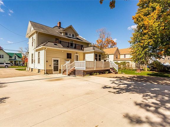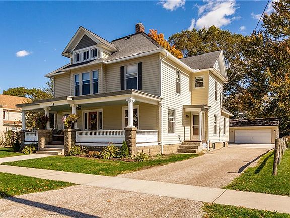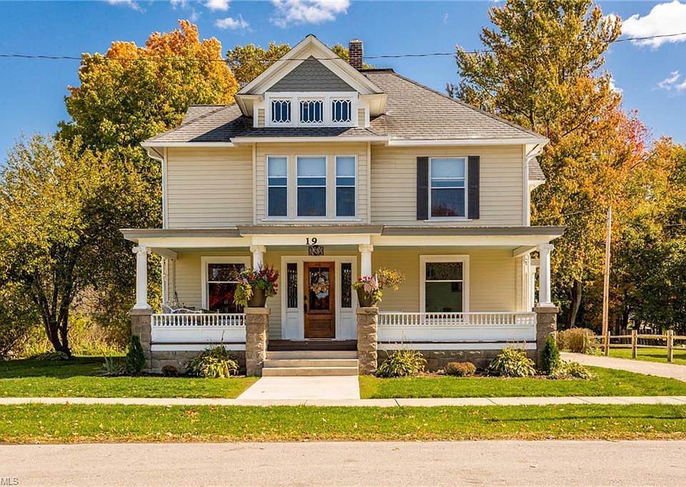 Built in 1908 by the town doctor and restored in 2020, this stately home is the perfect combination of old and new, loaded with modern amenities and architectural character. The home features over 2400 square feet of living space with 4-5 bedrooms, renovated kitchen and bathrooms, and hardwood floors throughout. The inviting front porch leads to the grand foyer showcasing the home's beautiful beveled lead glass windows, 9-foot ceilings, stunning staircase, and fireplace. From there, enter the bright living room or go through the pocket doors to a formal dining room with a lovely built-in china cabinet and stained-glass windows. The upgraded kitchen is outfitted with new white shaker cabinets, original farmhouse sink, restored marble countertops, stainless-steel appliances, and a cozy breakfast nook. A spacious first floor bedroom (or office) includes a walk-in closet containing the washer and dryer. The luxurious first floor bath has a large walk in shower, marble tile, and historic bead board ceiling. Upstairs are 3-4 more bedrooms with refinished hardwood floors, and access to a relaxing private roof top deck and a large walk-up attic. The renovated second floor bath contains a tub/shower combo, marble tile, new vanity, and high-end fixtures. Further updates include new insulation, furnace, electrical, and energy efficient storm windows. Outside you will find a deck and private yard perfect for entertaining guests, a brand new concrete apron, and a detached 3-car garage.