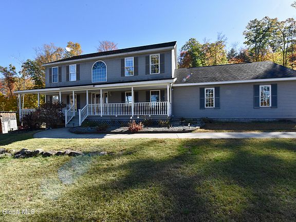 This 2464 Sqft,3bed,2.5 bath center hall colonial is a rare gem, perfectly nestled on 8.5 acres of serene land. If you are seeking privacy, breath taking views, and peace this home checks all the boxes. The 1st floor boasts an open layout w/ a formal dining room, spacious eat in kitchen, w/ new stainless-steel appliances, & a cozy sunken living room. Step outside onto the new back deck & soak in the tranquility of your surroundings. Upstairs you will find 3 generously sized bedrooms, 2 full baths, and convenient laundry room. Partially finished walk out basement offers 9ft ceilings, creating potential for additional living space. The outdoor area is just as captivating w/ stunning mountain views from the front porch, an outdoor wood boiler, 26X 28 oversized garage, & multiple outbuildings