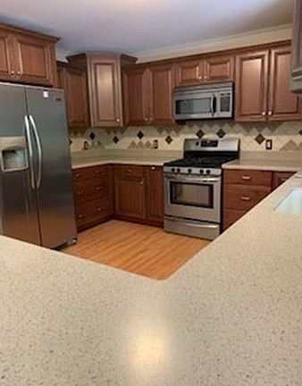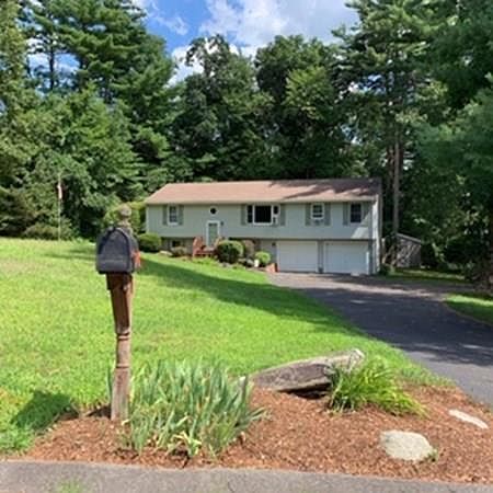 Spacious and bright freshly painted home has room for everyone. Executive kitchen with custom built cabinets with corian counter tops that leads to the Dining Area with access to the back deck that overlooks the wooded back yard. Large Master bedroom with large closet and private full bath located on one side of the house, with bedrooms 2 and 3 situated on the opposite side of the home for complete privacy. Finished lower level offers Family Room, Home Office, full bath with solid counter tops and a 4th bedroom. Private back yard that abuts conservation land and has a 10 x 27 yard shed. Great commuter location, and close to Mass Pike. All this on a terrific quite cul de sac street with lots of other families. New carpets just installed!!!