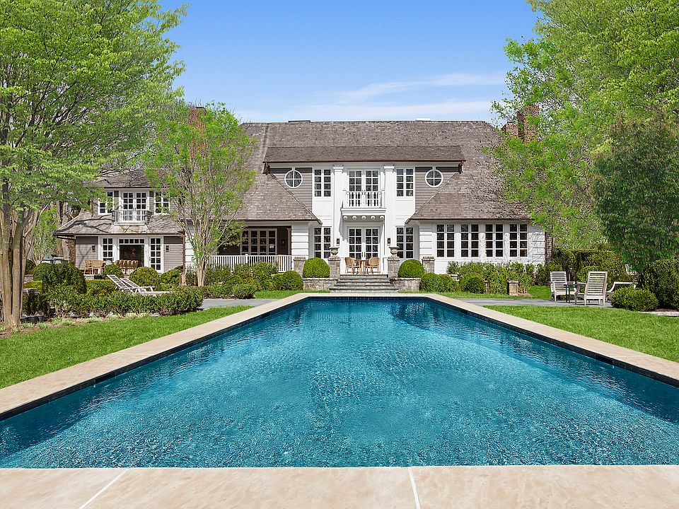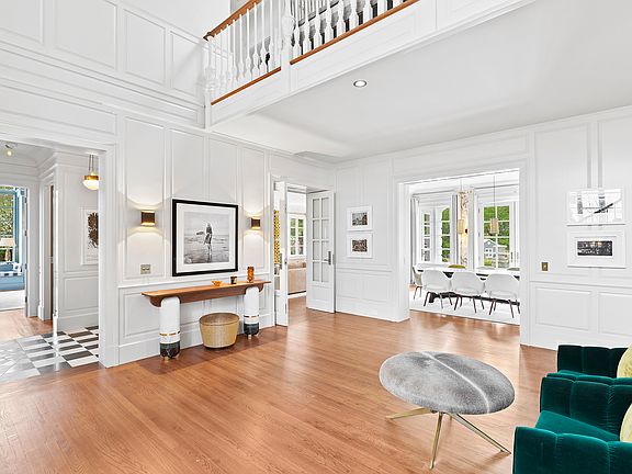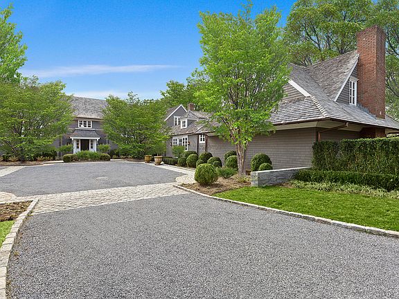 magnificently landscaped acres, was renovated in high, European style in 2019. Located in the heart of East Hampton's estate section, on a private dead end street, this home features formal and informal living areas, dining room, a paneled study, eat-in kitchen, eight bedrooms, seven full and four half slab marble bathrooms. The lower level includes a theater, gym space, game room and a wine cellar, as well as, a full staff suite that includes living, dining, bedroom and bathroom. Outside, there is a 20'x40' heated gunite pool with spa, as well as a heated gunite 12'x85' lap pool. Mature landscape surrounds the home with multi-level stone terraces. There is a sun area with a chaise lounge by the pools and a shaded seating area. Adjacent to the house is an outdoor living room and dining table for fourteen. Lush lawns, a variety of gardens and fountains and a pool house with bathroom and outdoor shower complete this magnificent estate.