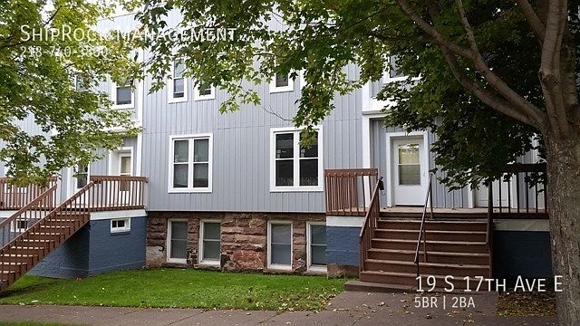 You will be surprised with the spacious interior of this home. 15-21 S 17th Ave E were originally built as townhomes back in 1923. Conveniently located in the East End or Endion division of Duluth it has access to local shops and less than one block from bus route. This property features 5 large Bedroom + 2 bathrooms with laundry on site. Enjoy spacious rooms with high ceilings and hardwood floors. Large, lofty windows provide plenty of natural light throughout. The living, dining, kitchen are located on the main floor, while bedrooms are located on the upper and lower levels allowing for additional privacy. Sliding glass doors provide access to rear deck and back yard. Tenants are responsible for the monthly rent charges of $2050 as well as electric, gas, sewer, and water utilities. Additionally, a garbage fee of $10 per occupant, along with a monthly technology fee of $6.95 per account, are applied directly to your rent charges each month. We provide a liability insurance option at $18 through our in-house policy, though tenants also have the flexibility and freedom to secure their own coverage if preferred. We make it easy! From scheduling a showing, paying your rent to submitting a maintenance request and signing your lease, it's all online. A showing is required before the processing of an application can begin, please wait to submit applications until after viewing the property. Follow us @shiprockmanagement St. ShipRock Management is an Equal Housing Opportunity company. For more information go to FHEO. Have questions about renting with us?