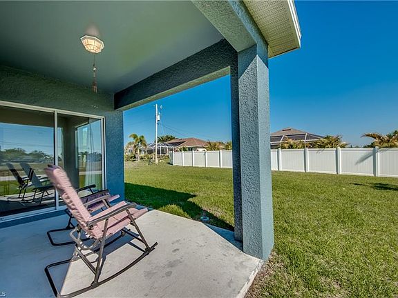 ASSESSMENTS PAID! SPACIOUS feel with high ceilings and split bedroom plan-master on one side and 2 additional rooms and bath on the other side. LIKE NEW home with snowbird owners. PRIVATE MASTER SUITE and bath in rear of home. Wide 4'4" hallway from front door. OPEN LAYOUT tiled living area includes kitchen, dining, and living room with windows and sliders out to backyard and covered back porch. PRIVACY FENCE is already in place thanks to rear neighbor. OVERSIZED LOT! Corner lots are great for boat owners to easily STORE A BOAT in back yard. ROOM FOR POOL! NO FLOOD INSURANCE required for this Zone X location. Waterfront homes are across the street. WONDERFUL LOCATION-so close to shopping, dining, schools, Veteran's Memorial Pkwy, Pine Island Rd. Sun Splash Family Waterpark, BMX track, freshwater BOAT RAMP, and Palmetto Pine Country Club are all within a 5 minute drive! The Gulf access BOAT RAMP on Burnt Store Rd is only 6 miles away. Builder warranty in place.