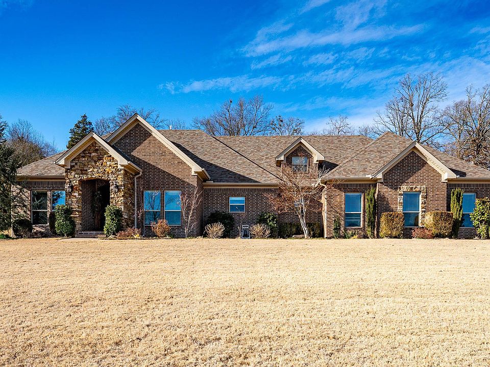 This beautiful custom-built home is tucked away in Porter Field Estates just of Hwy 25 sitting on one acre. The home is set back off the road to create the perfect statement with a large, sodded yard maximizing the best curb appeal. A long front walk meanders along the professionally landscaped flower beds to the arched, rock entryway. Once inside the double front doors, you're met with 15' ceilings which complement the size and view of your formal dining or sitting room, the family room with a gorgeous rock fireplace and mantle, a spacious kitchen with a huge granite island and a nice breakfast room overlooking the backyard and into the woods. The guest rooms have 9' ceilings and are on one side while the primary dominates the opposite side of the home. The primary suite also has 9' ceilings with 12' tray and the bathroom has a jacuzzi, double sinks with Corian counters, a tiled shower with double bench and a huge master closet with built ins. You're sure to spend many hours in your screened back porch with friends and family. Don't miss the extended patio and extra flag stone walkway and storm shelter. All of this with a fenced back yard for pets and young ones. New Roof 2023