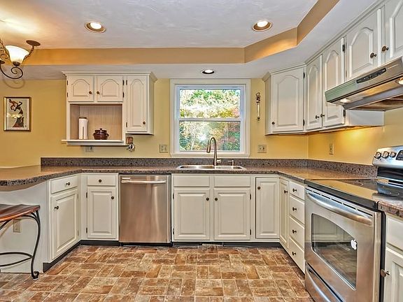 Nestled in an established cul-de-sac neighborhood, this Raised Cape offers 3 floors of living space.The oversized eat-in-kitchen w/stainless steel appliances has sliders to a large deck overlooking the impressive backyard garden area and the woods just beyond. The adjacent dining room and open living room showcase with hardwood floors. Master bedroom offers double closets, and there are an additional 2 good-sized bedrooms upstairs with a full bath. Also, 2 finished rooms in the basement offer potential for media room, home office, workout area or more along with impressive basement storage areas. Owned solar panels offer the buyer electricity savings. Plus Central Air! This home is in need of some cosmetic TLC: paint and carpet will make it amazing for the buyer who sees the bargain at hand, and the home is priced for these improvements. Wonderful home in a much-desired neighborhood setting, convenient to MBTA, highway, and more. All showings deferred until Saturday, 10/19.