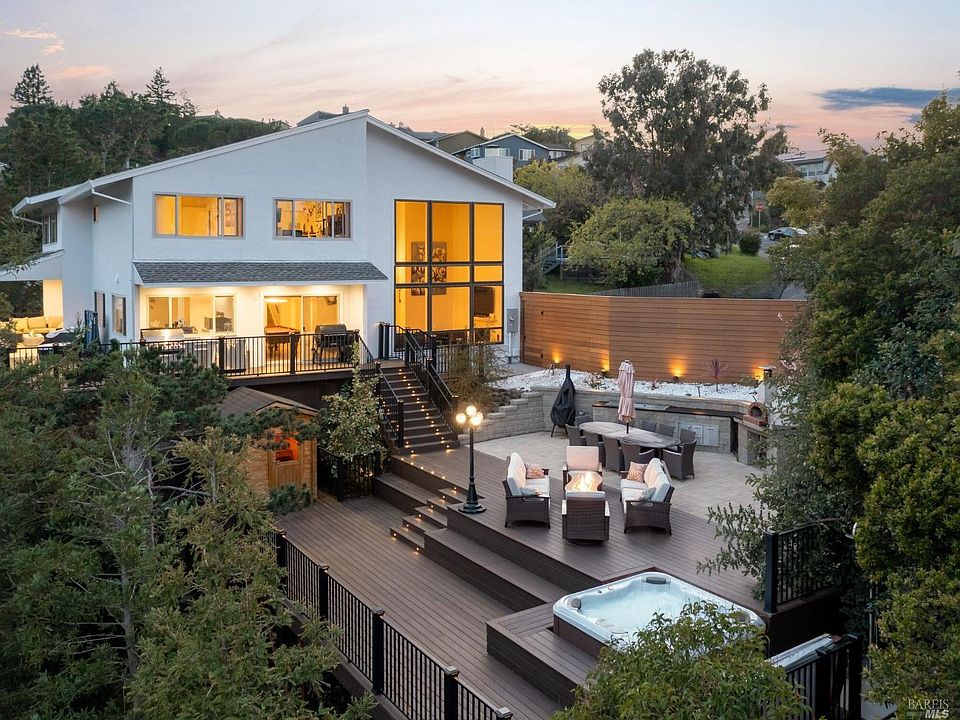 Tucked away at the end of a peaceful cul-de-sac in the highly sought-after Terra Linda neighborhood of San Rafael, 19 Santa Clara Court is a haven of luxury and an entertainer's delight. Spanning 2,950 square feet of living space (per Floor Plan Visuals), this home boasts five bedrooms, three and a half baths, a spacious and open great room, floor-to-ceiling windows, and an exceptional indoor-outdoor flow. The home offers a flexible floor plan that caters to a variety of lifestyles, marked by spacious living areas, and a seamless blend of indoor and outdoor connection. The outdoor living area features expansive decks that provide the perfect backdrop for al fresco dining, grand gatherings, or serene evenings by the fire pits. A lower deck with a jacuzzi, outdoor shower, and sauna adds to the home's functionality and appeal, offering a secluded retreat for relaxation and entertainment. Notable upgrades include engineered hardwood floors and smart home features, such as a six-zone Sonos audio system and smart lighting. Easy access to Marin County's finest hiking and biking trails, and Highway 101.