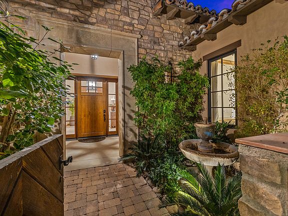 Introducing this stunning, modernized villa with panoramic mountain views, located in the Villas of Mirada, Rancho Mirage. Sitting on an almost a half acre lot and boasting nearly 3,600 sqft of casual living, this home exudes desired indoor-outdoor living arrangement, perfect for the ideal desert dweller. Entry in the great room and experience the awe of the towering vaulted ceilings which provides the perfect area for entertaining family and friends as the unrivaled views show off the horizon. Unwind at the end of a long day by retreating to the oversized master suite which extends to the backyard via an outdoor patio, complete with fireplace. The large spa-like master bathroom highlights his and her sinks, a separate vanity, toilet room, large tub and a generous walk-in closet. Take your guests outside the enjoy the mountain views from the large infinity edged pool, cook dinner in the outdoor kitchen and end the night with s'mores over the fire put at the edge of the property. Other features include owned solar system, upgraded light fixtures, power awnings and more. An amenities agreement with the Ritz-Carlton Rancho Mirage, the only 5 star resort in the valley, sets this home on a level all its own! Don't miss the opportunity to own this gem!