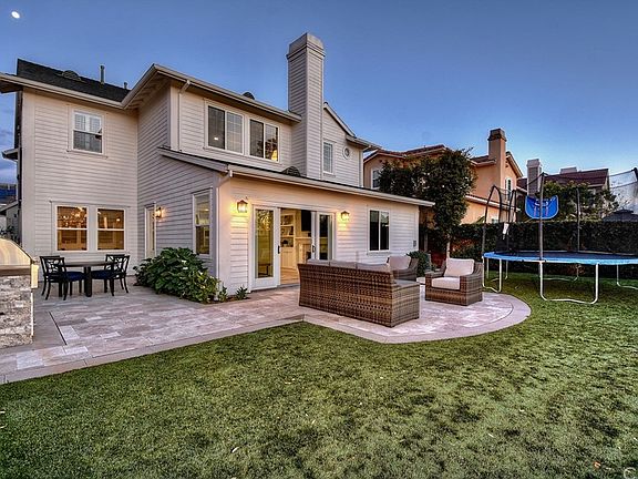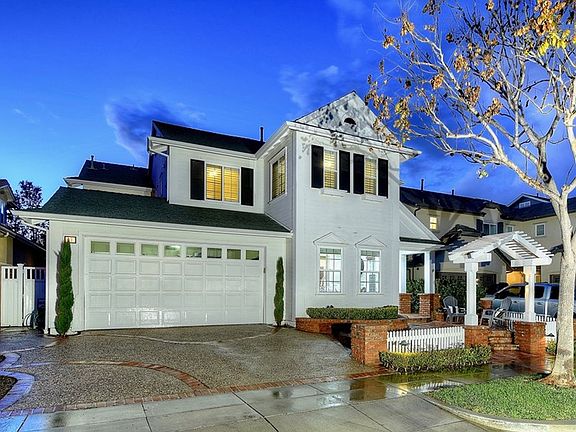 With its combination of traditional Coastal Colonial architecture and a location along a tree-lined cul-de-sac street in Ladera Ranch, this beautifully upgraded and customized home is a genuine American Classic. A sophisticated white and gray color palette complements living areas that span approx. 3,200 s.f. and display European oak wood flooring, wainscoting, crown molding, custom window and door casings, recessed lighting, plantation shutters, drop-down shades and designer paint. Home to 5 bedrooms and 3 upgraded baths, the elegant residence hosts a seamless great room and remodeled kitchen area complete with a custom fireplace, custom built-in cabinetry and shelving, new quartz countertops with subway tile backsplash, Shaker cabinetry with soft-close doors and drawers, a nook with custom built-in china cabinet, and high-end stainless steel KitchenAid appliances including a double oven, microwave, 6-burner cooktop with hood, a wine cooler and French door refrigerator. Sunset and valley views enrich an opulent master suite that boasts a separate sitting/bonus room, spacious walk-in closet with custom built-ins, luxe soaking tub and separate shower. The laundry room features custom cabinetry, and the garage reveals epoxy flooring and custom built-in cabinetry. Beautifully landscaped, grounds are characterized by brick hardscaping in the front yard, and a view-enhanced backyard with water-saving synthetic turf, a built-in BBQ and stone patios.