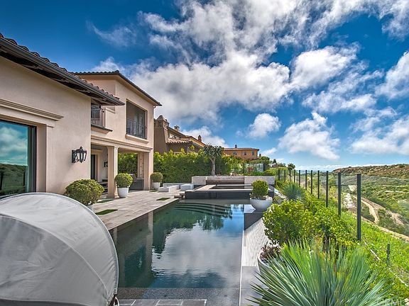 Welcome to Newport Coast's exclusive 24-hour guard gated community of Pacific Ridge. This Fiona plan 3 view home exudes opulence and sophistication, and boasts more upgrades similar to the builder's model homes, both inside and out. Proximity 5,800 square feet of luxurious living space rests on a nearly 10,000 square feet lot, and provides an expansive open floor plan with great design and overall layout . This dwelling offers four bedroom suites with a family entertainment room, gym room, and large office room. Two of the rooms can easily be converted to make 6 bedrooms. The beautiful entrance provides a unique, open air courtyard. Decadence at its finest as you enter into the main floor area where large sliding glass panels open up bringing the exterior and interior together as one. The main floor offers an oversized guest suite, work-out room, an open concept chef's kitchen featuring two oversized central islands with seating, a prep kitchen, stellar wine cellar with seating, two fireplaces in formal living room and family room. Beautiful designer and upgrade touches throughout. Top of the line designer backyard offering an outdoor kitchen area with an oversized BBQ island, ceiling heaters, fire feature, top of the line infinity pool and spa, covered seating, with serene canyon and partial Pacific Ocean views from both floor levels. Residents of Pacific Ridge enjoy resort-style amenities, close proximity to beaches, freeways, and world-class shopping and dining.