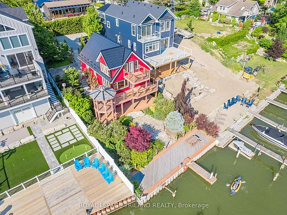 LAKEFRONT ALTERNATIVE | SENSATIONAL & ICONIC GRAND BEND RIVERFRONT CHARMER W/ PANORAMIC LAKE VIEWS | 50 FT OF BOAT DOCKAGE | ROCK SOLID 4 SEASON WALK-OUT DUPLEX | 3 STORIES OF WATER FRONTAGE FOR EPIC SUNSETS: This 5 bed/3 full bath/2 kitchen 2611 sq ft waterfront charmer is a definitive example of the phrase ONE-OF-A-KIND. Are you in search of a property that can offer lakefront views & breathtaking sunset panoramas with your boat docked 30 ft from your front door? Such a phenomenal combination of benefits is extremely rare. These exceptional properties, of which Grand Bend has very few; offering boat docks w/ LAKEFRONT benefits situated just 325 mtrs from Grand Bend's famous & forever sandy Main Beach at the river mouth; are kept in the family & cherished by their owners for decades. And within this elite limited-edition category of Real Estate, 19 Shady Lane is irrefutably at the top of the charts due its outstanding geographic position. The photos are true, a visual truth that is even more stunning in person, outdoors & in, from every riverfront & lakeside angle in the SW facing sections of the house. Yes, this lot is superb, but the magic & beauty of this property is found throughout the enchanting home that is so perfectly positioned upon it. This extremely well-kept gem is the Romeo of the riverfront from the various levels of lake view patios, decks, & covered + uncovered outdoor spaces to the immaculate gardens & that lifetime steel eco roof - & the interior is just as tight! The classic hardwood flooring & endless waterfront windows frame in the perfect setting, with the oversized lakeview riverfront master w/ private balcony being unbeatable. The home also boasts a completely self-sufficient walk-out 2 bed-unit w/ its own kitchen. The clever placement of the 5 bedrooms across 3 levels w/ main level laundry is ideal for a multi-generational situation & the secured/gated entrance & parking is perfect for all the toys! Time to live the dream!