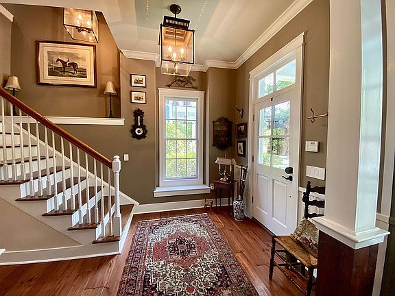 Located in the extremely desirable phase 1 of Shell Hall, this gorgeous, CUSTOM BUILT Charleston-style model home was designed by the esteemed Allison Ramsey Architects, and features an exceptional level of character, elegance, quality, and attention to detail throughout. . Southern charm abounds from the moment you step onto the traditional covered front porch with its iconic haint blue ceiling, and through the front door of this incredible home, which features gorgeous wide-plank antique heart pine flooring throughout, soaring 10' ceilings, an abundance of natural light that streams in from large windows, as well as an open floor plan ideal for entertaining. . The kitchen is truly a chef's delight, boasting tall custom cabinetry, granite countertops, all professional-grade stainless steel appliances including a 6-burner gas range with hood, and the layout makes for an incredibly functional space for any connoisseur of the culinary arts. Just around the corner from the kitchen, there is also a custom-built walk-in wine room and accompanying pantry closet. . Relax in the spacious main living area, cozy up by the wood-burning fireplace, or step outside through French doors into a beautifully manicured, lush, and private backyard retreat, perfect for enjoying a meal alfresco, playing a lawn game, or perhaps enjoying the fire pit with friends and neighbors. Custom landscape lighting makes for a lovely evening ambiance, as well. Those with four-legged friends will appreciate that the yard has been completely fenced in, and brand new empire zoysia sod was just laid. . Upstairs, you're greeted with a massive master suite featuring a wall of East-facing windows, which not only allows for a beautiful view of the main neighborhood square, but also offers incredible, expansive vistas of the morning sunrise. Owners will appreciate an abundance of storage featuring his and hers closets, as well as an newly-updated en-suite master bathroom. . Just down the hall, you’ll find two more lovely, spacious and light-filled bedrooms, as well as a guest bathroom featuring a double vanity. Conveniently, the brand new washer and drier are located adjacent to the 2nd floor bedroom areas as well, along with an oversized linen closet. . Ideally located near the crossroads of the Bluffton & Buckwalter parkways, Shell Hall is a vibrant, thriving, and neighborly town-square style community, featuring a variety of luxury amenities directly across the street, including an Olympic-sized swimming pool, fitness center, tennis courts, brand new playground, bocce and croquet lawns, as well as an incredible clubhouse for community and private events alike - all with incredibly low HOA fees.