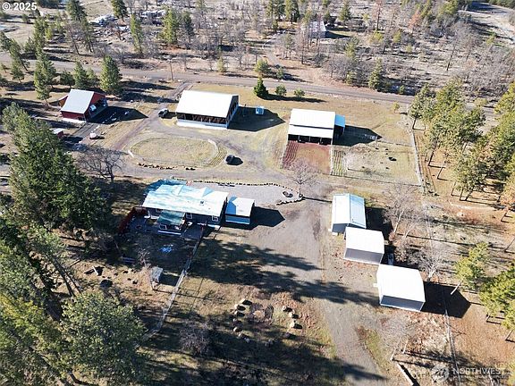 Beautiful 10-acre horse property, fully fenced & cross-fenced with 2 drive-through gates & electric hot-wire. Includes a 60x60 covered riding arena, outdoor riding ring, and a 36x48 barn with insulated tack room, wash bay with on-demand hot water, four Noble stalls with turnouts, & two lean-tos. The 2005, 1,550 sq ft manufactured home features a smart floor plan, quality laminate flooring (carpet in one bedroom), walk-in tile shower, & covered back patio with extended decking. Recent updates include metal roof, furnace, heat pump, & submersible well pump. Wired for generator backup. Also includes attached carport, detached garages, fenced dog area, chicken coop, and Starlink internet. Two legal 5-acre parcels w/mature pines & open pasture.