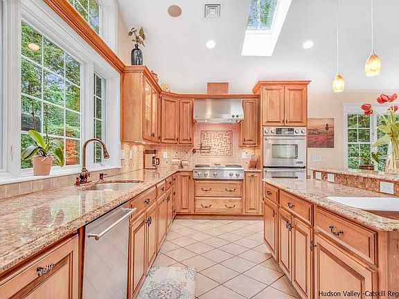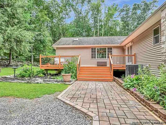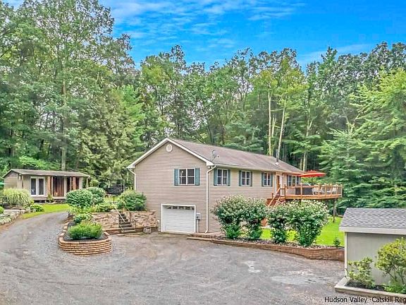 Forget, "Hello." This house had me at 2 wet bars! Step into what presents itself as a modest home and you will be amazed by the high end finishes and flourishes within. Start in the entertaining chef's kitchen with multiple granite countertops, stacked Jenn-Air ovens, hooded propane stovetop with pot filler, custom cabinetry and breakfast/cocktail bar, all basked in natural light thanks to skylights. The kitchen is open to the dining room--with the first of 2 wet bars--which in turn opens to the newly renovated living room with 12 foot vaulted ceiling and cozy freestanding wood stove. Pass through the elegant foyer past 2 guest bedrooms and a bath to the en suite master bedroom with steam shower and walk-in closet/vanity. The master bath and closet/vanity each has its own skylight. Downstairs is a world unto itself for you to enjoy, or to be enjoyed as a separate apartment. Pass through a workout room to the spacious family/entertainment/game room with it's own granite surfaces and your second wet bar. Downstairs also has the 4th bedroom, full bath, bonus library/office, functional laundry/utility room with folding table and sink and oversized one car garage. Outdoors enjoy decks that flank each side of the house, manicured lawns and flower beds and a goldfish pool fed by a waterfall in a rock garden! All this in a great location in low tax Olive between Woodstock and Phoenicia off Route 28, the major artery of the Catskills. Enjoy all the region has to offer, world class natural beauty, skiing, hiking, biking, fishing, tubing, arts, culture and cuisine. Minutes from our newest recreational resource, the amazing Ashokan Rail Trail. This is why we live here. Now you can, too!