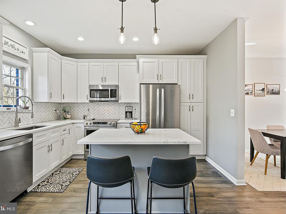 Welcome to this newly updated Hunters Run home! You'll be in awe of the gorgeous new kitchen featuring white cabinets, stainless steel appliances, island with seating for two, and a custom built-in buffet with wine fridge. There are new hardwood floors throughout the main floor with new recessed lighting and light fixtures to give a modern vibe. The main floor flows nicely from the natural light-filled living room to the dining room and kitchen with large back deck. Upstairs, you'll find a large primary bedroom with vaulted ceiling and newly updated en suite bathroom. To complete the upper level, there are two more bedrooms, full bathroom, and large linen closet. The spacious lower level boasts a 4th bedroom/gym/office/playroom with custom built-in Murphy bed, laundry room, two additional massive storage closets, and walk-out family room with pellet stove, perfect for cozying up on a cold winter day! Don't forget about the dual HVAC zones, which is great for energy efficiency! Other notable new interior features include: brand new water heater in 2022; new dryer; all (4) new toilets; new lower level bathroom tile floor, fixtures, and sliding glass shower/tub door; new half bathroom tile floor; Nest thermostats; new primary bedroom ceiling fan; new primary bathroom vanity and glass shower door. All you have to do is move in! Plus, enjoying the outdoors could not be easier with your newly fenced-in back yard, neighborhood access to 41 miles of the NCR trail, and the expanse of Lock Raven Preserve just a stone's throw away! This location is also so convenient to Wegmans, other shopping and dining, and I-83 for easy commuting. Be sure to schedule your tour today!
