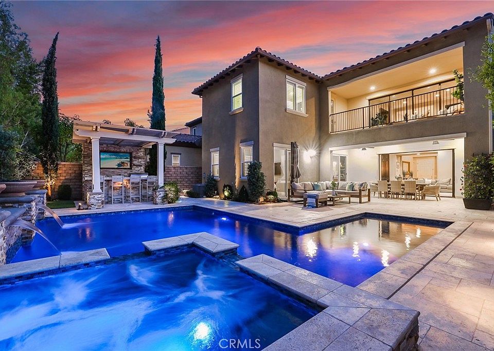 Incredible, One-Of-A-Kind Resort Style Pool Home, Fully Upgraded, Premium Private Lot, FULLY PAID FOR SOLAR AND TESLA WALL! Sophistication and Elegance are the Hallmarks of this Impeccably Designed Home featuring Stunning Upgrades in every direction. Upon entry the Upgrades and On-Trend designs are immediately distinguished with Stunning Hardwood Floors, Gorgeous Custom Chandelier and Soaring Two-Story Cathedral Ceilings allowing for an abundance of Natural Light to flood the home. The Spacious Great Room features Built-In Surround Sound Speakers, Designer Interior Paint, Dual Built-In Media Cabinet and Shelving, Ceiling Fan, Fireplace and Massive Sliding Panel Doors that open to the Award Winning Backyard Oasis. The Chef's Kitchen leaves nothing to the imagination featuring Stainless Steel Appliances w/Built-In Stainless Steel Refrigerator, Farmhouse Sink, Custom Pendant Lighting, Built-In Wine Fridge, Tile Backsplash, Beautiful Upgraded Cabinets that stretch to the ceiling and Massive Center Island w/Bar Seating. Continue Outside and Prepare to be blown away by THE Entertainers Dream Backyard. The Covered California Room offers the perfect Transition to the Backyard featuring Two Ceiling Fans, TV and Beautiful Travertine Flooring. Just beyond the California room sits the Stunning Salt Water Pool and Jacuzzi both of which have just received new tile and new pebble tech resurfacing..Dual Waterfalls, Fire Pots, Built-In BBQ w/Bar Seating and Sink, Stacked Stone TV Wall, Overhead Trellis, Custom Lighting, Stunning Landscape, Custom Travertine Hardscape and Supreme Privacy w/No Rear Neighbors..Vacation every weekend in your own backyard! The Downstairs Bed and Full Bath + Downstairs office and Half Bath round out the first floor. Upstairs you will find the Multi-Purpose Loft/Media Room Featuring Custom Built-In Speakers, Massive Retractable Stacking Doors, Ceiling Fan and Balcony overlooking the incredible backyard. Upstairs also features The Convenient Upstairs Laundry w/extra Cabinets and Four additional Bedrooms including the Spacious Primary Featuring Custom Interior Paint, Hardwood Flooring and Ceiling Fan. The Primary Bath Stuns w/upgraded Cabinets and Counter Tops, Stand Alone Soaking Tub, Upgraded Walk-In Shower, Walk-In Closet and Plantation Shutters. Additional Features include Whole House Water Filtration System, Built-In Shelving in the Garage, Built-In Security System and Water Filter in Kitchen.. Come see this Amazing Trophy Property Today!