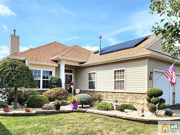 Welcome to this prestigious 55+ gated community located in the Renaissance at Cranbury Crossing. This beautiful open style ranch home features spacious 2 Bedrooms + Office/3rd Bedroom, 2 Full Baths, double-sided fireplace, Granite Countertops, 42'' Cabinets, Alarm System, Solar System w/ Battery Back Up, Attic Fan, Extended Deck w/roll out awning, Professional Landscaping w/paver walkway, Stone on Front, 2 Car Garage and Furnace/AC recently update. Primary Bedroom offers a spacious living suite w/bathroom (walk In Shower, Tub and Double Sink Vanity) and a large walk-in closet. This private gated community with lush grounds offers a wide variety of amenities; Club house, outdoor pool, fitness center, bocce, pickle ball, library, BBQ/picnic area and so much more. Just minutes to the NJ Turnpike and other transit options. You will find this community convenient to it all and move in ready. Make your appointment today!